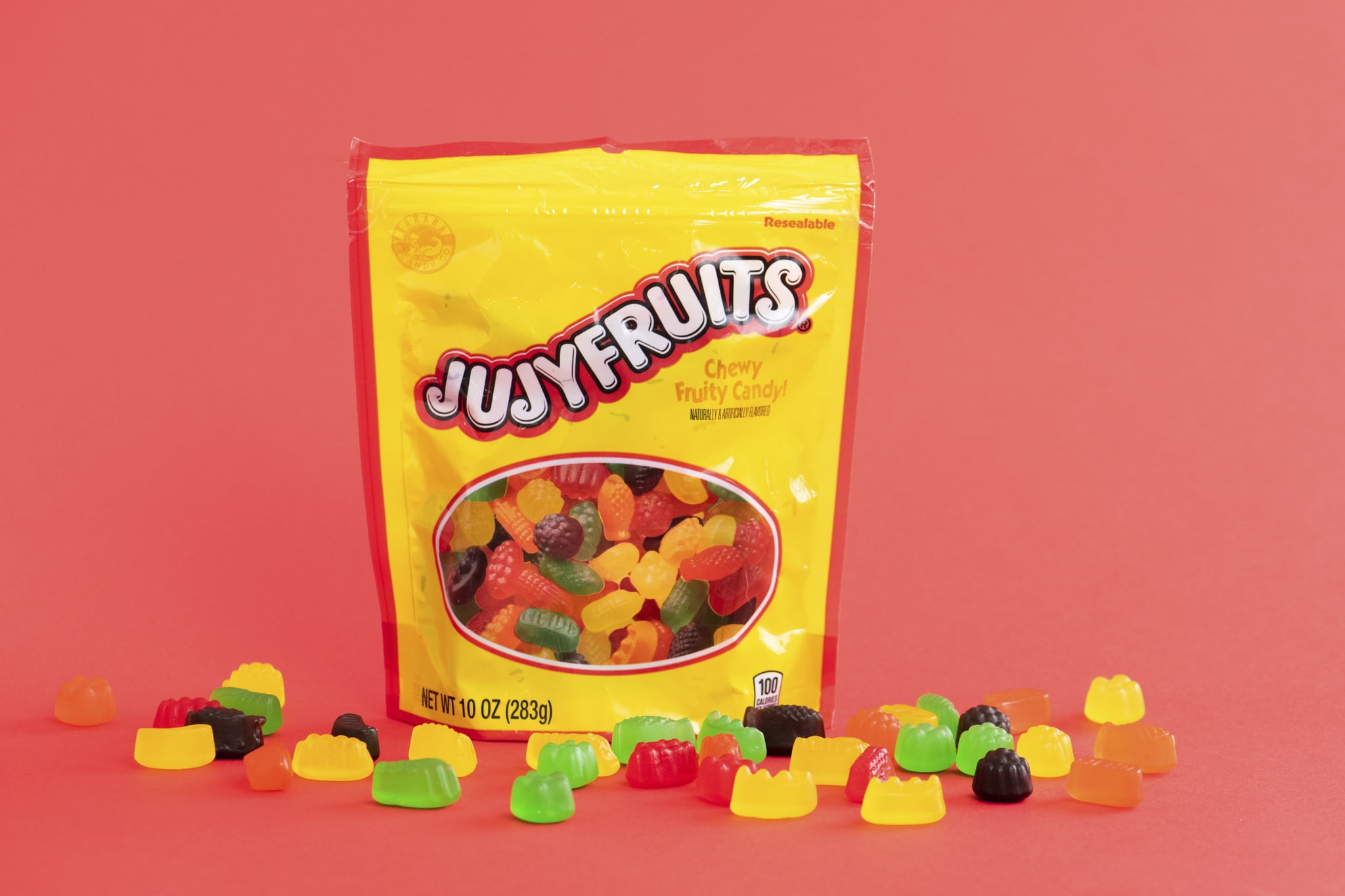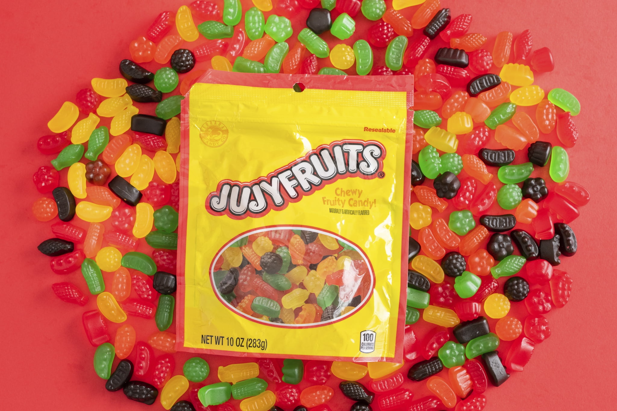 This stand-up bag of small, chewy, fruit flavored candies, are in shapes that have nothing to do with their flavors. With shapes like asparagus, tomato, grapes, banana, pineapple, raspberry and pea pods. It is the candy color that cues their delicious flavors of raspberry, licorice, lime, orange and lemon. Jujyfruits are a truly unique candy classic. First enjoyed in the U.S. in 1920, and a German tradition before that. They?re a lot like gummies, but they?re in a league of their own.