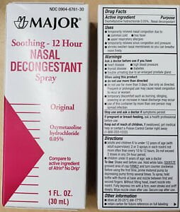 Major Soothing 12 Hour Regular Nasal Decongestant Spray, 1 Fl. Oz.MAJOR 12 HOUR NASAL DECONGESTANT SPRAY OXYMETAZOLINE HYDROCHLORIDE-N/A Clear 30 ML UPC 309045711309
