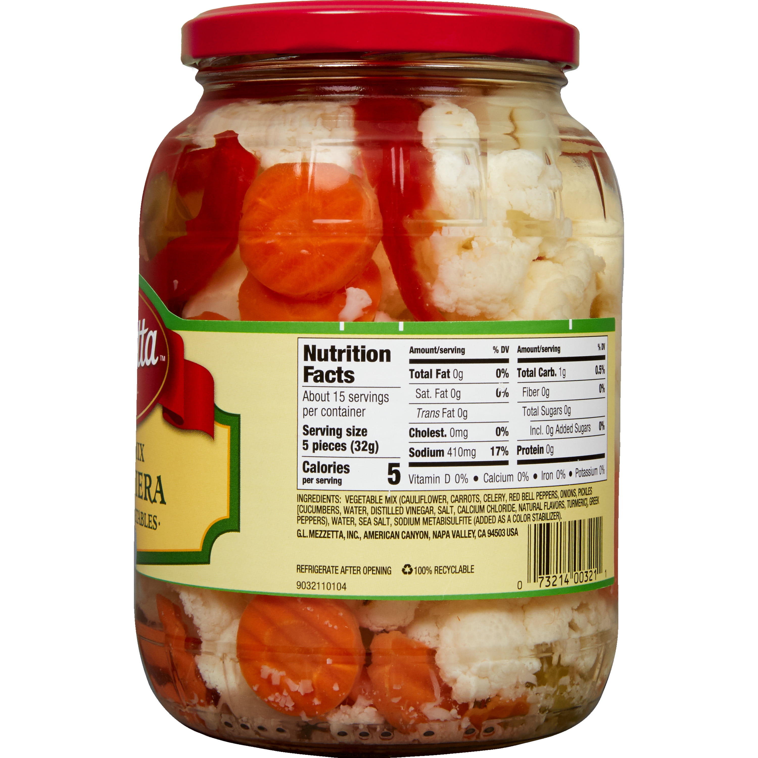 Mezzetta Italian Mix Giardiniera is a quick and satisfying fat free and low carb snack. Serve alongside cheeses and cured meats as part of an antipasto platter. Roughly chop and toss into tuna, egg or chicken salad.