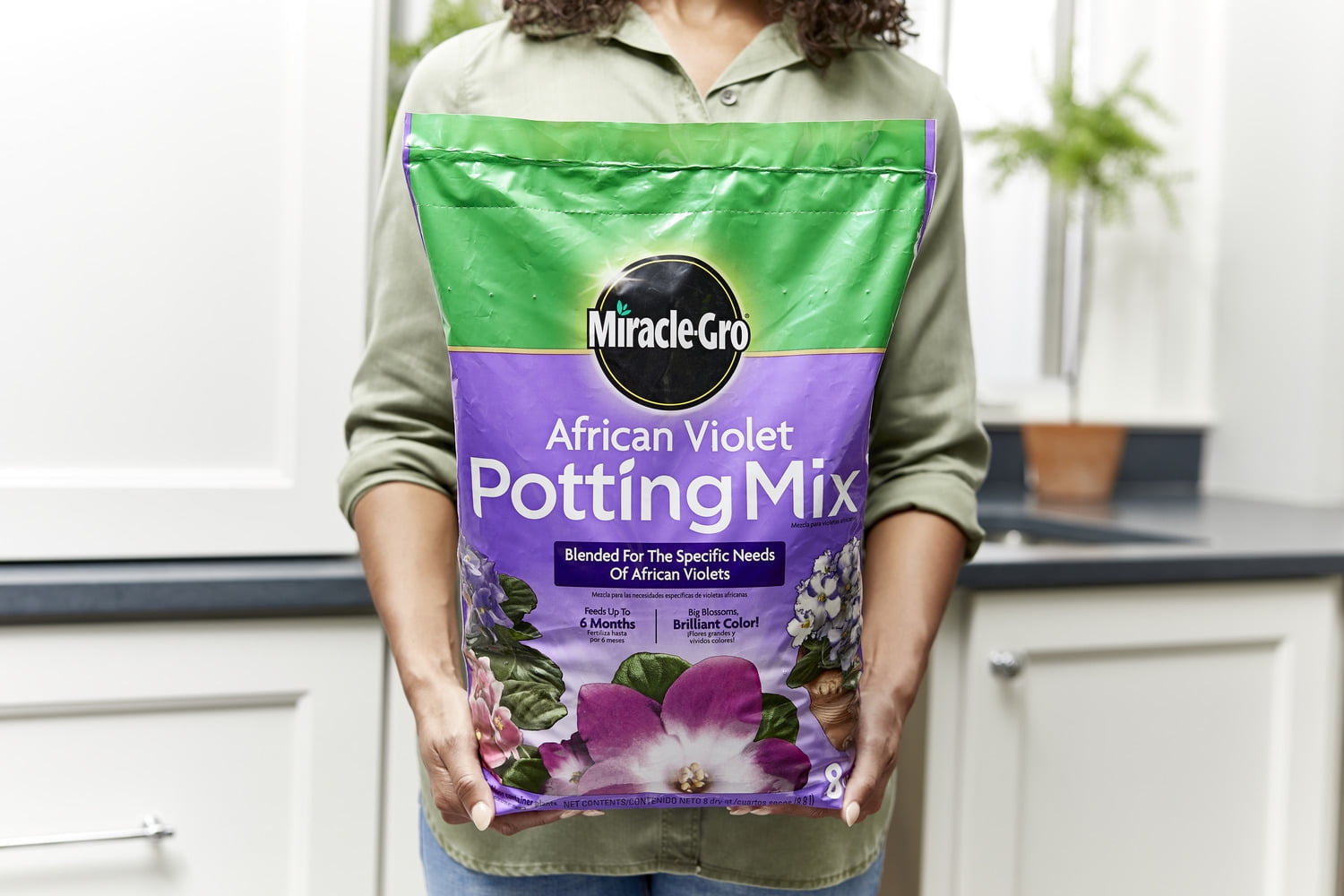 Take care of your unique flowers with a potting mix especially for them. Use Miracle-Gro African Violet Potting Mix, blended for the specific needs of your African Violets. The mix feeds these plants for up to 6 months. For best results, use it with Miracle-Gro Blooming Houseplant Food and when potting or repotting indoor or outdoor container plants. Grow big blossoms with brilliant color with Miracle-Gro.