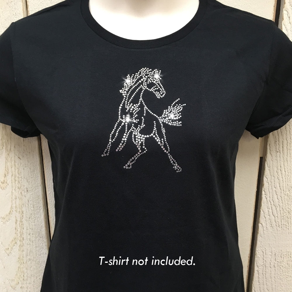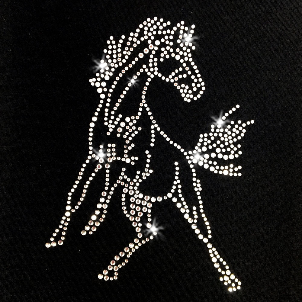 Use this bucking mustang bronco horse mascot design alone or pair it with text Iron-on rhinestone transfers like BASKETBALL, COLTS, or MUSTANGS. This design is also perfect for horse lovers or rodeo fans! These high quality clear Korean crystal rhinestones sparkle brilliantly. Simply peel, stick and iron to apply this horse design to your own t-shirt or fabric.