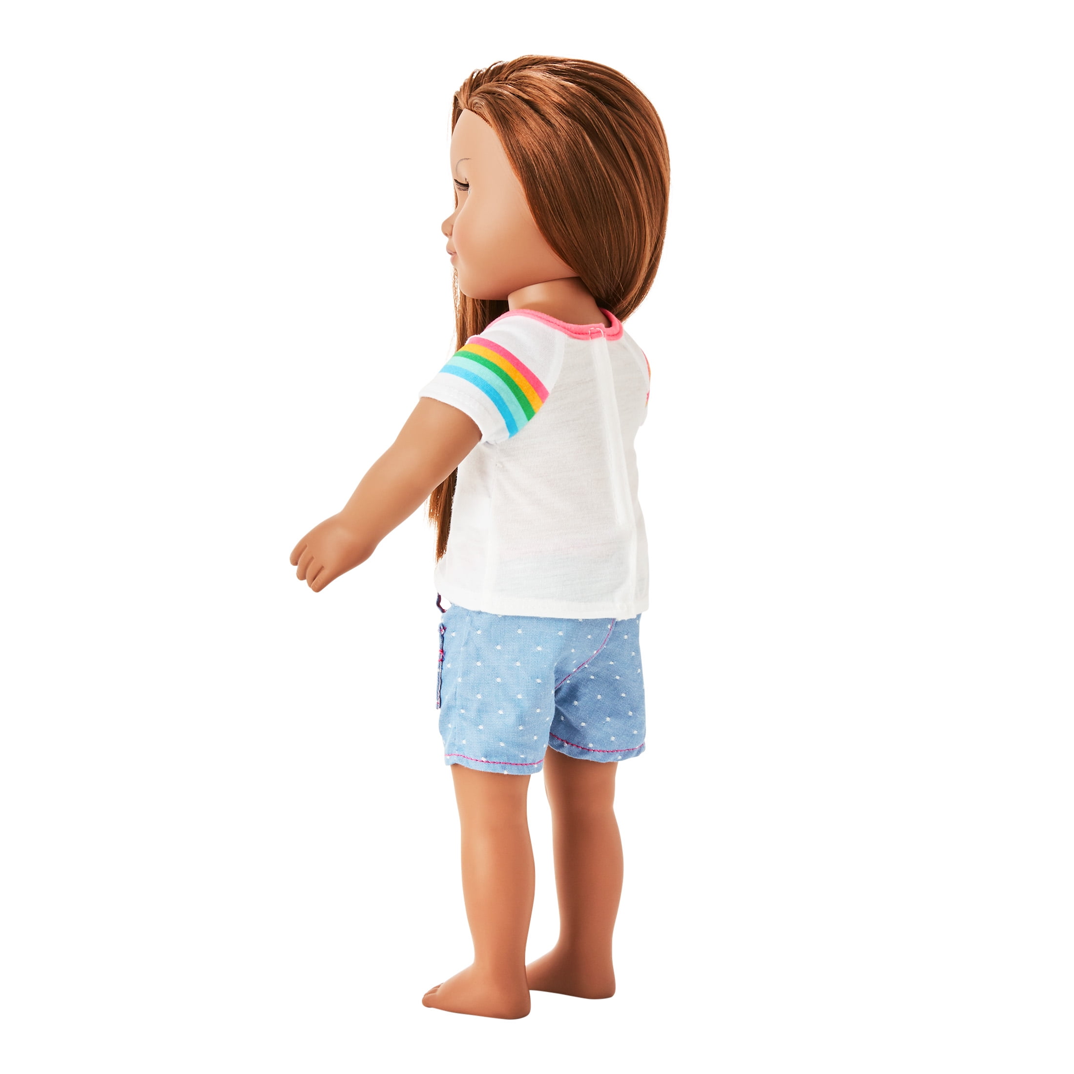 - Includes a pair of denim shorts and a rainbow-striped tee shirt.