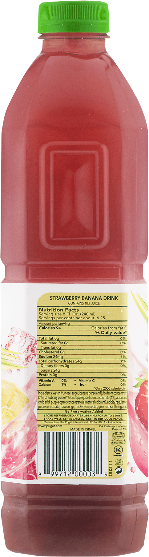 Juice Drink, Strawberry Banana 50.7 fl oz (1.5 lt) Preservative free. Contains 10% juice. No preservatives added. Made in Israel. Store refrigerated after opening for up to 5 days. Shake well. Serve chilled. Keep in dry cool place. 50.7 fl oz (1.5 lt) ISRAELPRGA2 JC RTD PL STR