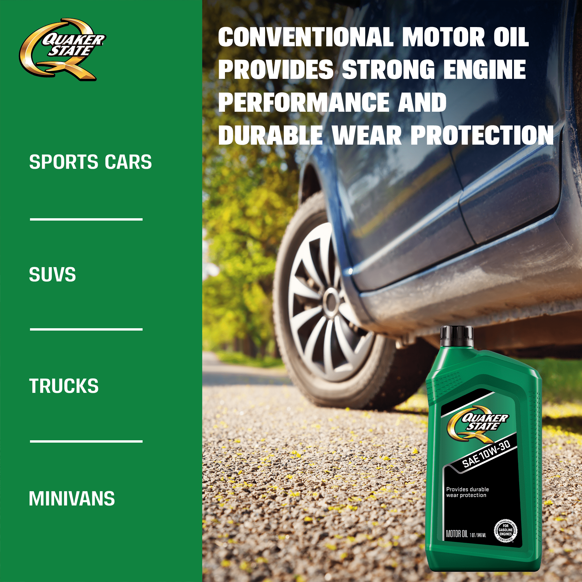 Quaker State 10W-30 conventional motor oil helps engines survive daily commutes from high-speed highway operation to repetitive, stop-and-go driving. It maintains the required viscosity from start to finish, providing optimal protection. Quaker State Motor Oil combats engine sludge and deposits, providing rust protection from harmful acids generated by engine contaminants. It reduces engine wear, providing durable wear protection.