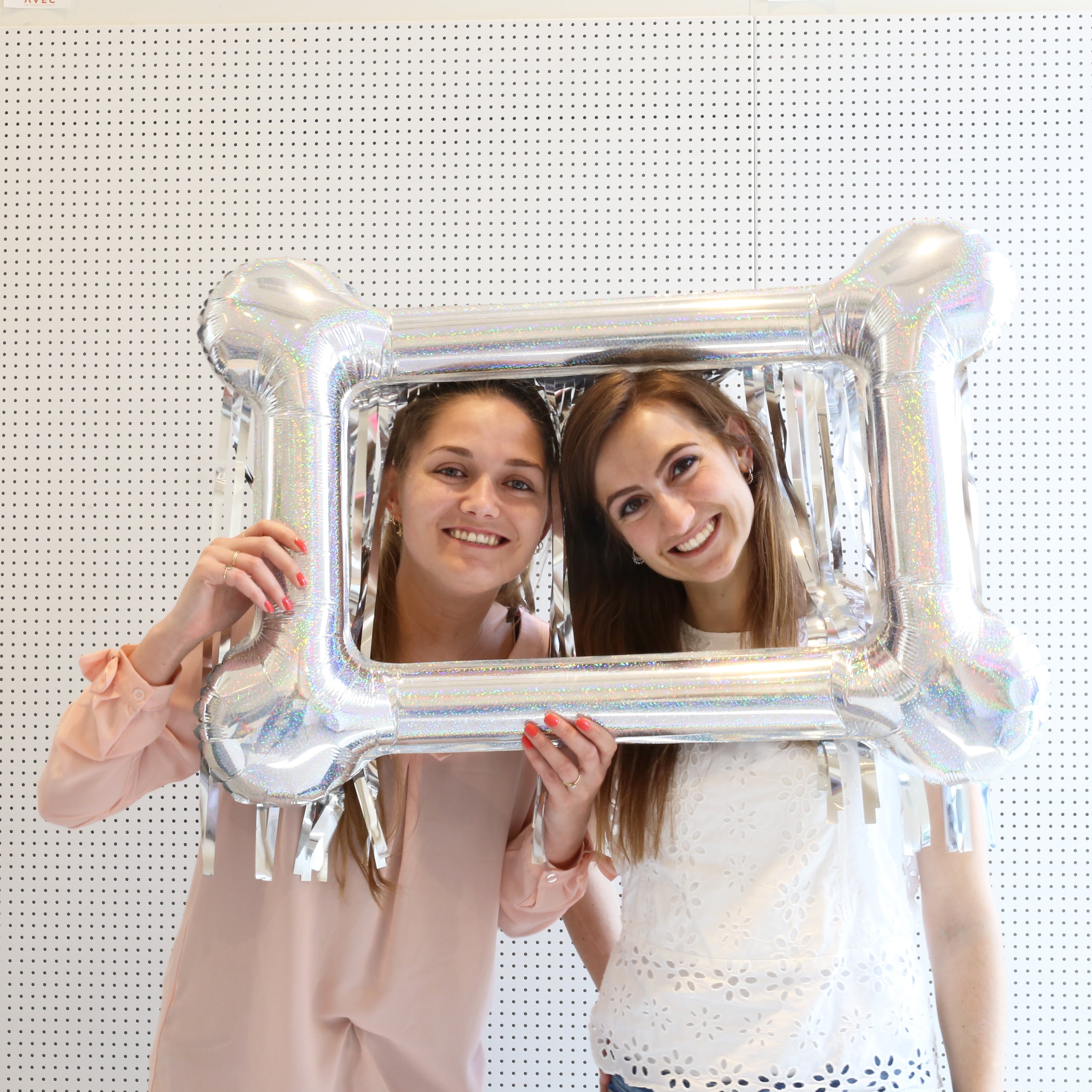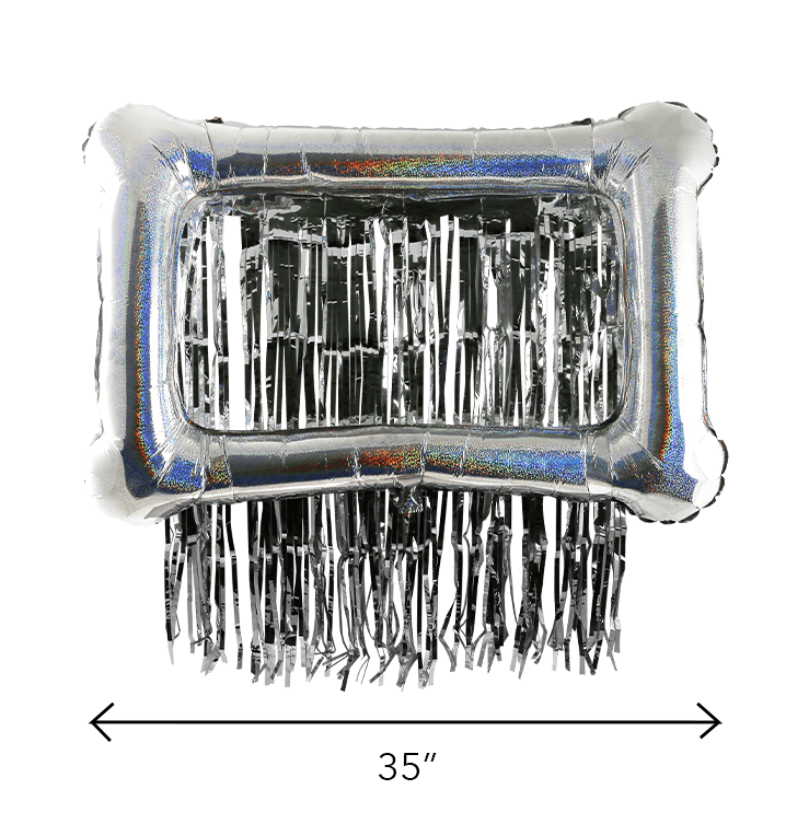 Xonex self portrait photo frame foil balloon with fringe. Just inflate, pose and shoot⦠Perfect for selfies or fun party pictures! Shiny silver rectangular frame can fit up to 2 people. Silver fringe easily affixes to top of frame to create a sparkling backdrop. Measures 30in x 40in. Includes inflate straw and instructions. Easy to assemble.Measures 30in x 40in, Durable material, Can be easily deflated for repeated use, Includes inflate straw and backdrop fringe.