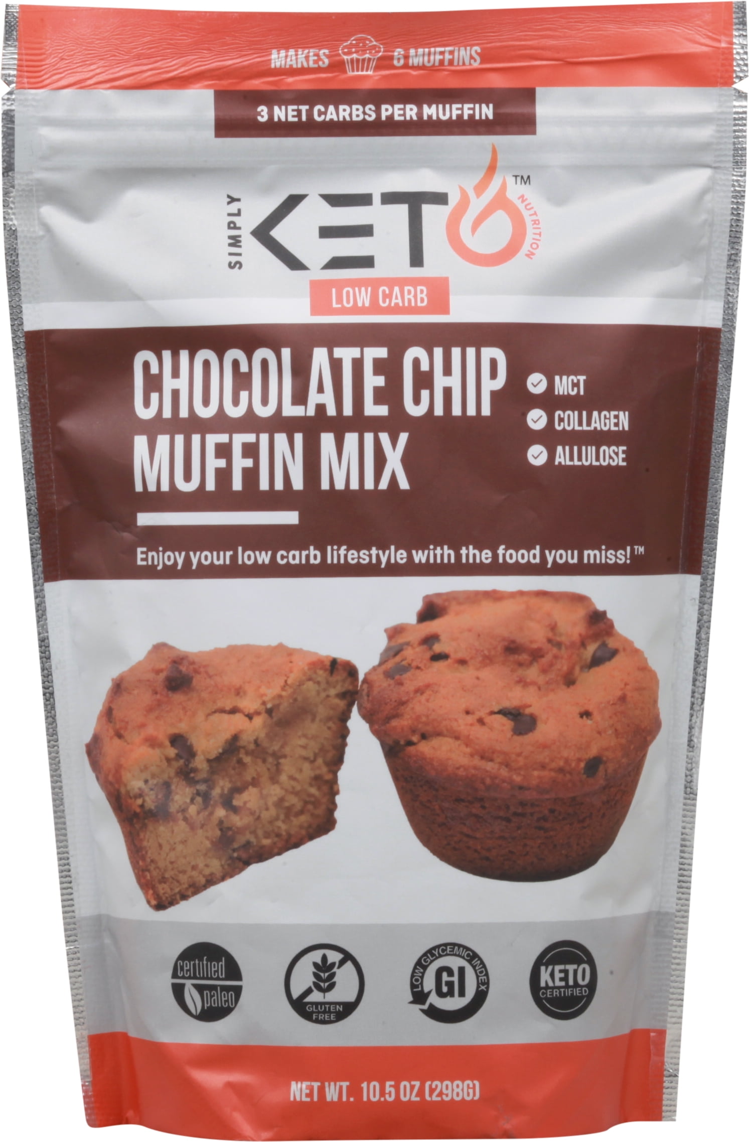 - 3 g net carbs per muffin. Net Carb Math: Net Carbs = Total Carbs – Fiber – Sugar Alcohol. Certified Paleo. Gluten free. Keto Certified. Low carb. Low glycemic index. Makes 6 muffins. MCT. Collagen. Allulose. Enjoy your low carb lifestyle with the food you miss. Stay Connected. Facebook. Instagram. Pinterest. Contact us at support(at)simplyketonutrition.com.