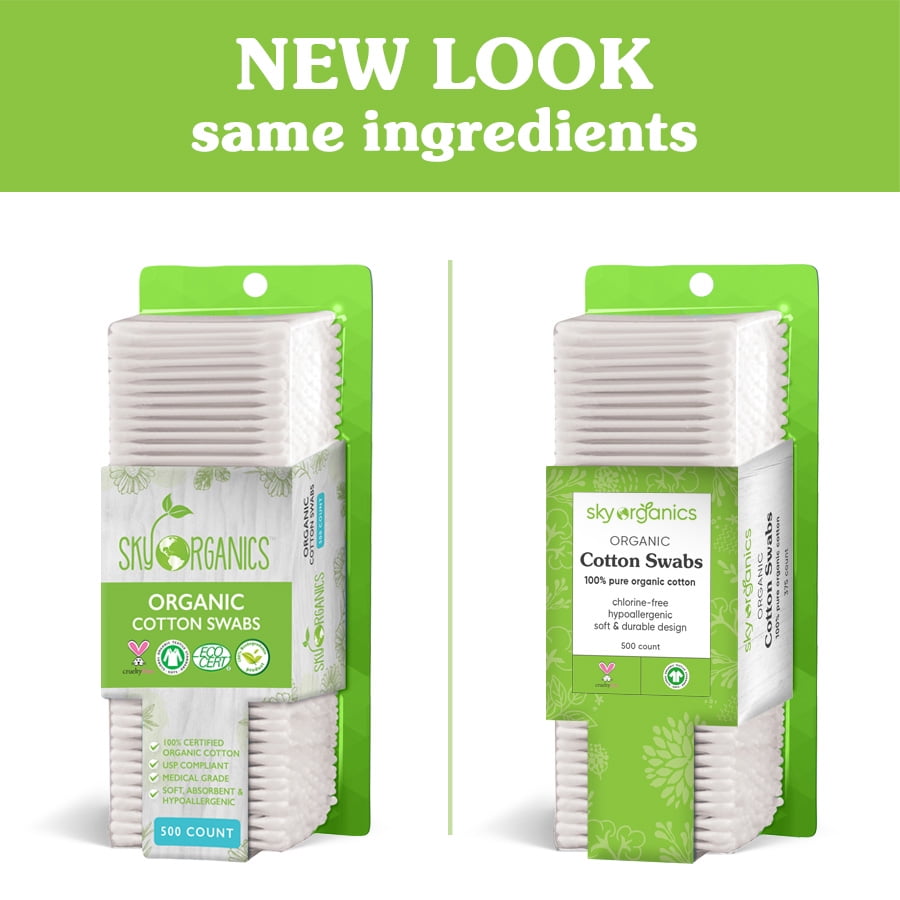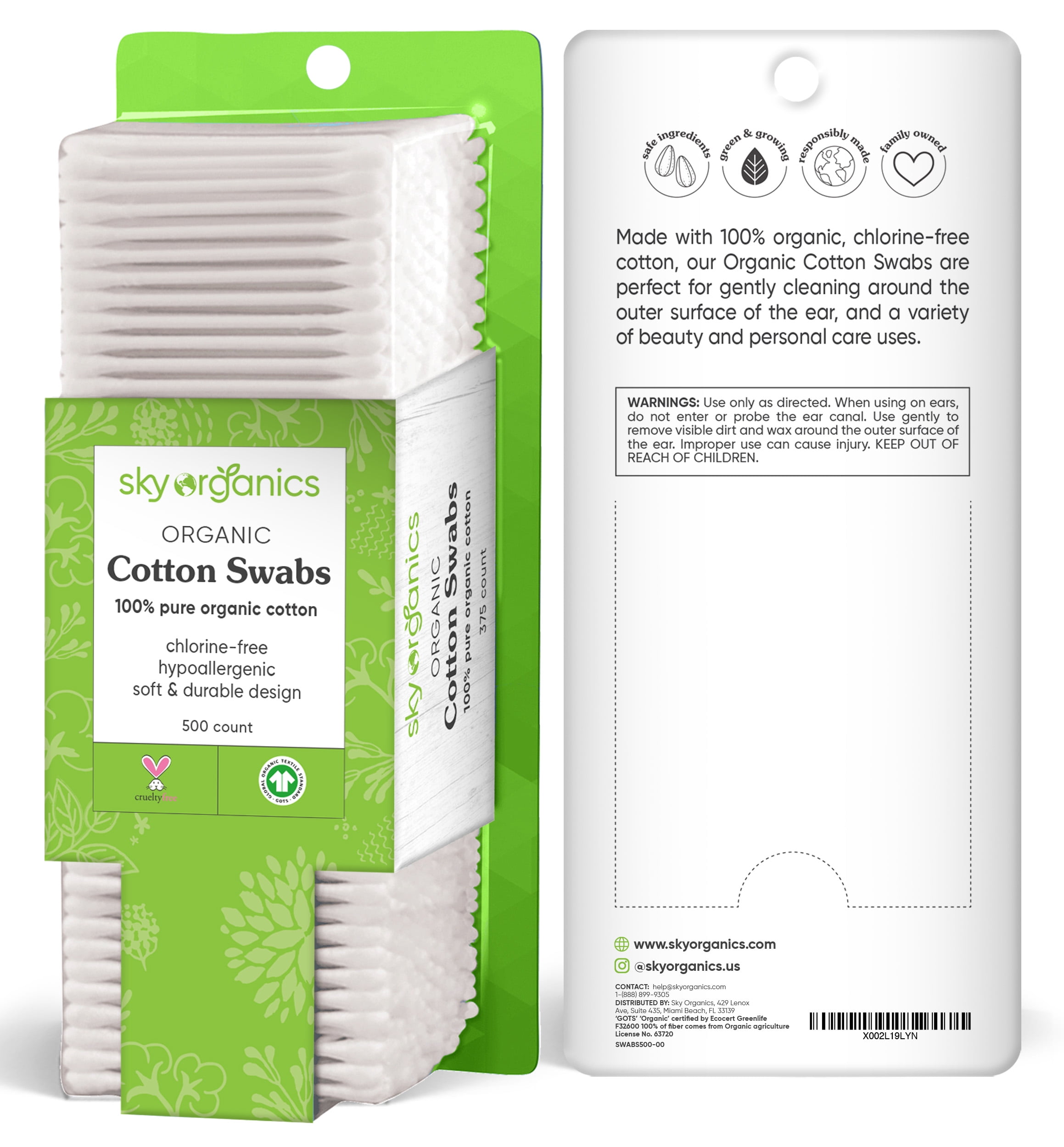 Product Description An Everyday Essential Sky Organics Organic Cotton Swabs are an all-natural household essential that boast a variety of uses. Use our mindfully made Cotton Buds to blend, apply, and remove cosmetics, ointments, and balms, to gently cleanse the ears and nose, or even for detail oriented craft projects or household cleaning! Whatever you use our ultra-gentle Q-tips for, youâll be glad you chose the eco-friendly, EcoCert certified Organic option. Personal Care with a Conscience Made with certified Organic, medical grade, highly absorbent, GOTS certified cotton, Sky Organics Cotton Swabs are the green standard in all-natural, cotton products. 100% Biodegradable, our Swabs are made with sustainably sourced cotton, making them the environmentally friendly choice for you and your family. Chlorine and fragrance-free, and made with ultra-soft cotton, Sky Organics Cotton Swabs are safe and gentle enough for the more sensitive of skin types. How to Use: To clean ears, gently stroke swab around the outer surface of the ear. CAUTION! Use only as directed. Do not enter ear canal. Entering ear canal could cause injury. Keep out of the reach of children. Ingredients 100% pure, GOTS certified Organic Cotton Warnings For external use only. Keep out of reach of children. Key Features * Made with GOTS certified organic cotton* Ideal for personal hygiene, spot removing makeup, and applying ointments* Bleach and Fragrance*Free* 100% Biodegradable* Dual*ended