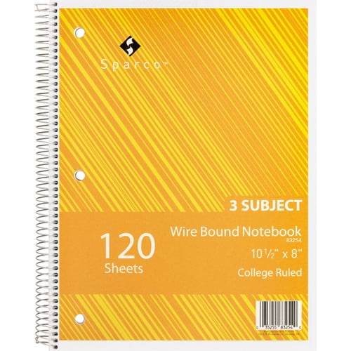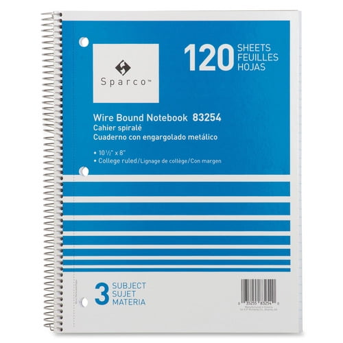 Wirebound, three-subject notebook features Kraft dividers and a stiff cover and back. Bright white sheets are college-ruled in blue lines with 1-1/4 inch left margin in red and offer a 16 pound weight. Each sheet is perforated for easy tear-out. Notebook is three-hole punched so it’s ready for storage or transport in a standard three-ring binder. Notebook contains 120 sheets.