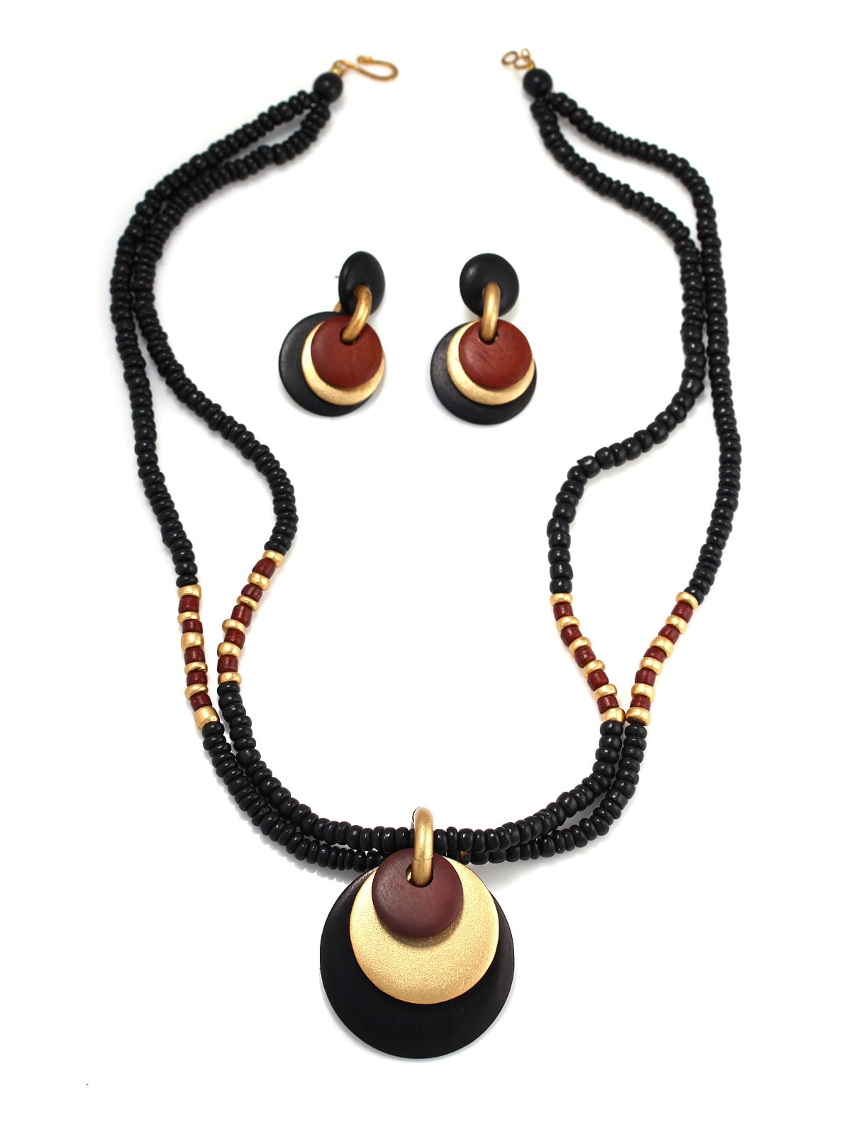 TAZZA WOMEN’S GOLD BROWN AND BLACK WOOD SEED BEAD EARRINGS AND NECKLACE SET
