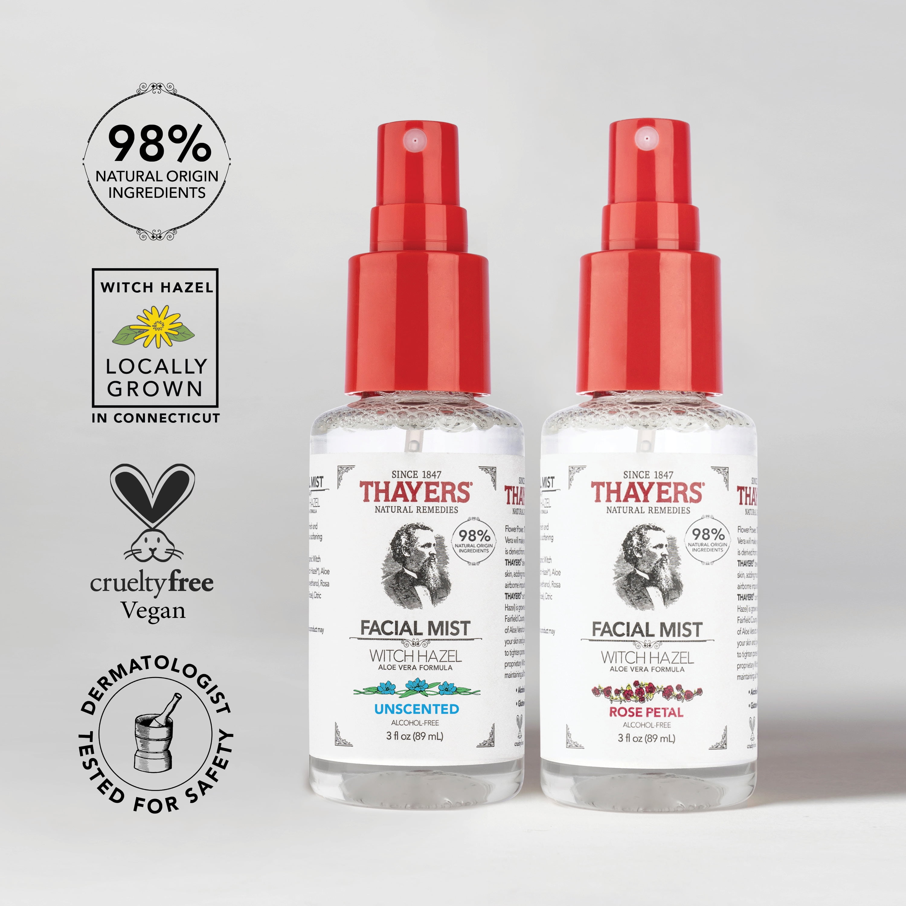 Flower Power. Make your skin bloom with THAYERS Rose Petal Face Mist. This pH balanced, hydrating travel size face mist is derived from a time-honored formula, developed by Thayers to cleanse, tone, and moisturize skin. Formulated with Rose Water and our unique, proprietary blend of Aloe Vera and non-distilled Witch Hazel that is grown exclusively for Thayers on a family farm in Fairfield County, Connecticut. By avoiding distillation of our Witch Hazel, we’re able to preserve the naturally-occurring, beneficial tannins which are known to offer antioxidant benefits. Our face mist formula imparts a natural glow to your skin. Thayers elixirs have been a fixture in medicine cabinets for generations – once you use them you’ll know why.