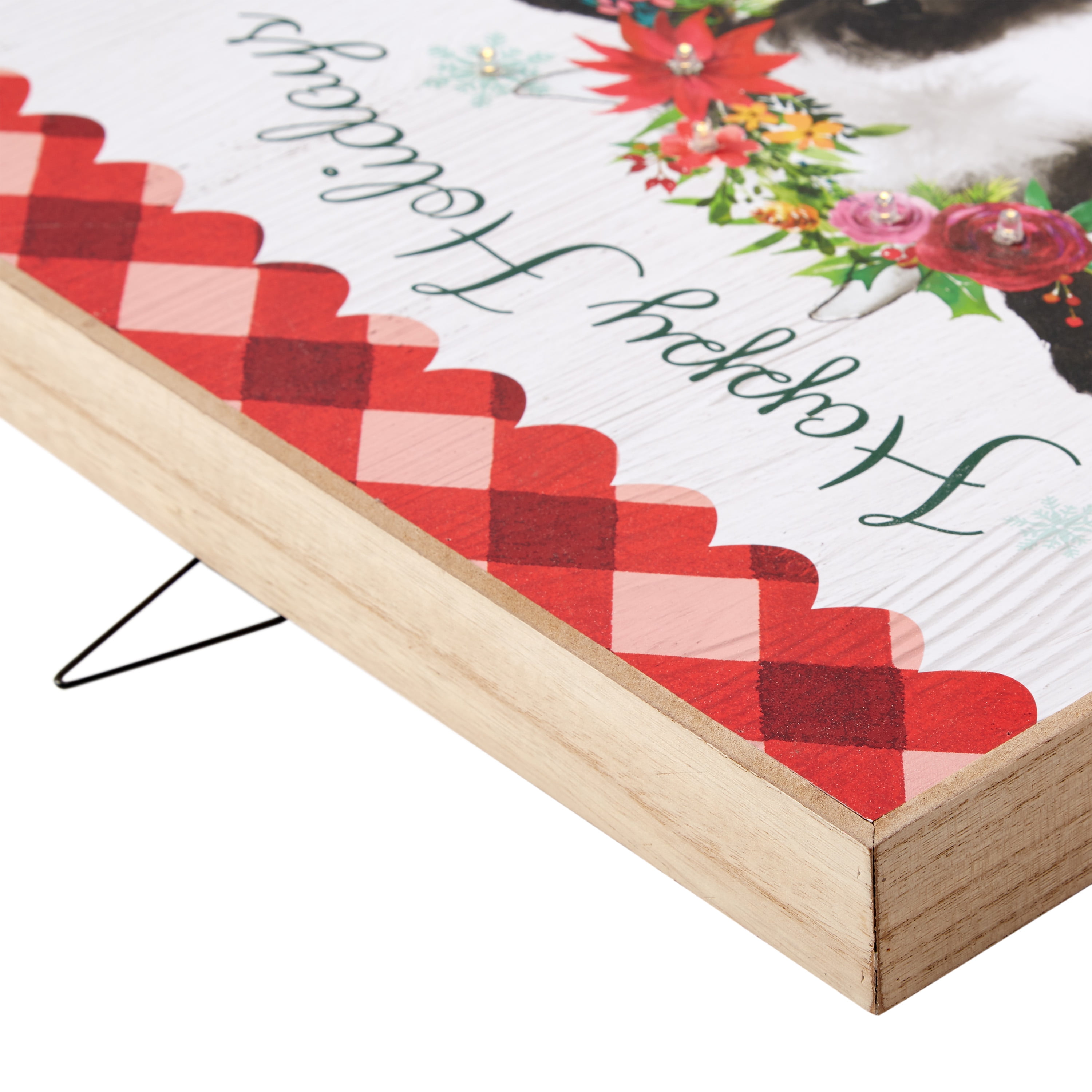Let your holiday spirit shine this Christmas with The Pioneer Woman Happy Holidays LED Hanging Sign. Friends, family, and holiday guests alike will enjoy the festive sentiment shared by this sign as they celebrate the holidays with you. Everyone is certain to be delighted by the sign’s image of a sweet cow wearing a wintry floral crown and bell necklace below green script lettering that reads, "Happy Holidays," and will quickly become captivated by the warm glow of the light-up accents throughout. With the included metal hanger on the back of the sign, you can easily place it up on a wall or door in any room of your home to add instant holiday appeal. Make this Christmas your most merry yet with The Pioneer Woman Happy Holidays LED Hanging Sign.