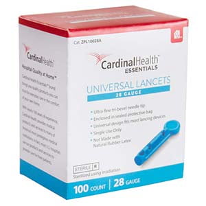 Cardinal Health Essentials 28 Gauge Lancets, ultra thin tri-bevel tip. Enclosed in a sealed bag, Blue, sterile, single use. Universal design fits most lancing devices. 100/box.Universal Lancets, 28G Blue (100 Count)