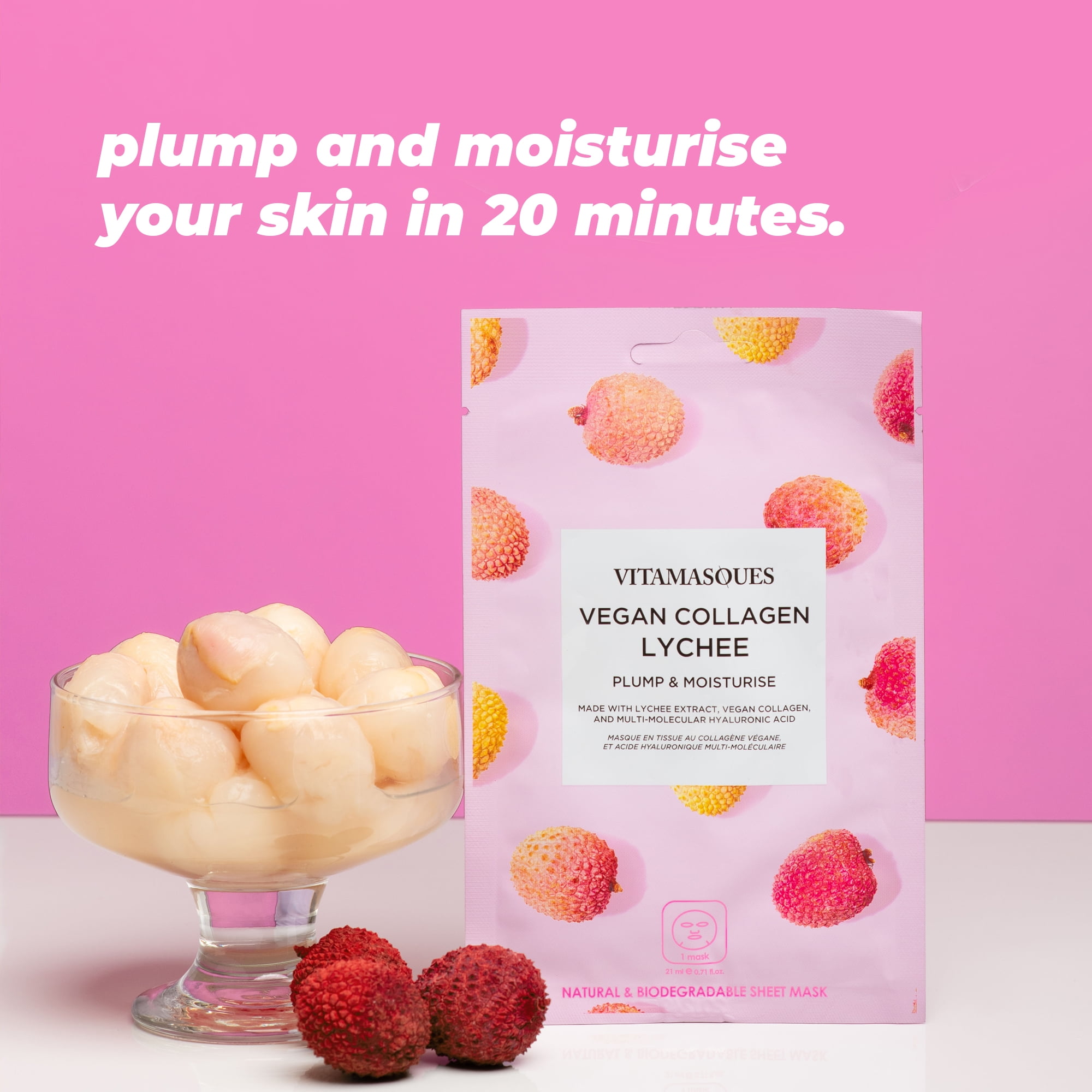 - Made with Lychee Extract, Vegan Collagen and Multi Molecular Hyaluronic Acid