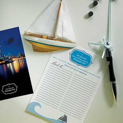 This little ship magnet is an amazing novelty to promote an event, complement a boat party or announce an upcoming destination wedding. Intricately detailed with cloth sails and a wooden hull, Two magnets embedded into the back hold it firmly to any metal surface. Great presentation packaging finishes this piece.