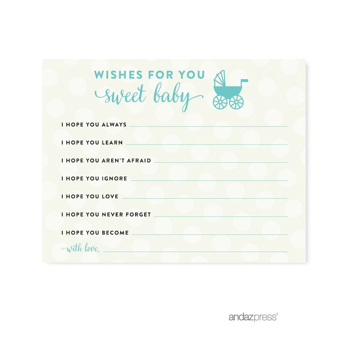 Looking for fun ideas to get everyone to celebrate the arrival of your little one? This fresh and fun baby shower game idea is perfect for both small and large groups of men and women. This is not your run-of-the-mill baby shower game that will induce cringe-worthy reactions and silent internal screams from your guests. It may be cheesy and ridiculous, but this out-of-the-box baby shower game will keep your guests laughing and talking for hours. This is one unique baby shower game that is actually fun (really!) for the mommy-to-be and her special guests. Professionally printed on heavy cardstock, these baby shower game and activity pieces can also serve as a unique framed scrapbook memory of your special day. Don’t forget to get a baby shower prize for the winner – and no, it can’t be a poopy diaper. Made in the USA.Wishes For Baby Diamond Blue Baby & Co. Baby Shower Game, 20-Pack