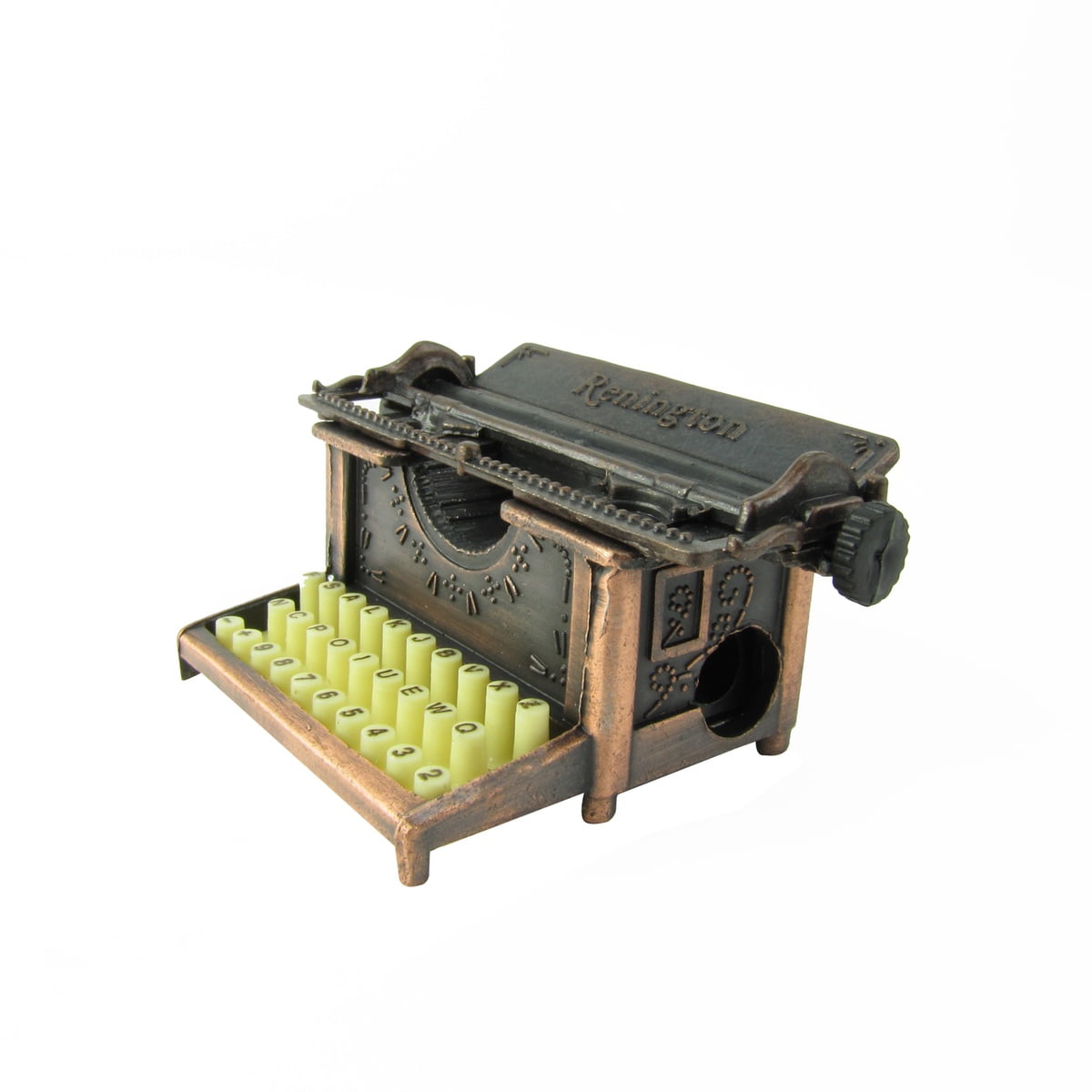 - On the bottom of the metal typewriter is a fully functional pencil sharpener, making it perfect to sit on a desk, or a unique addition to a pencil sharpener collection