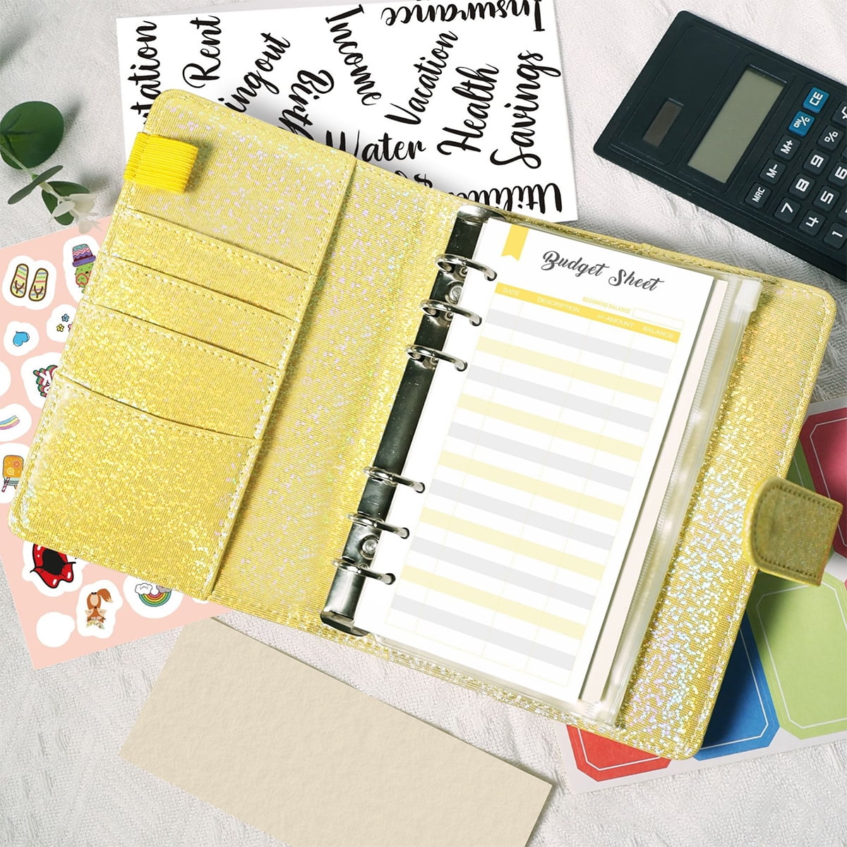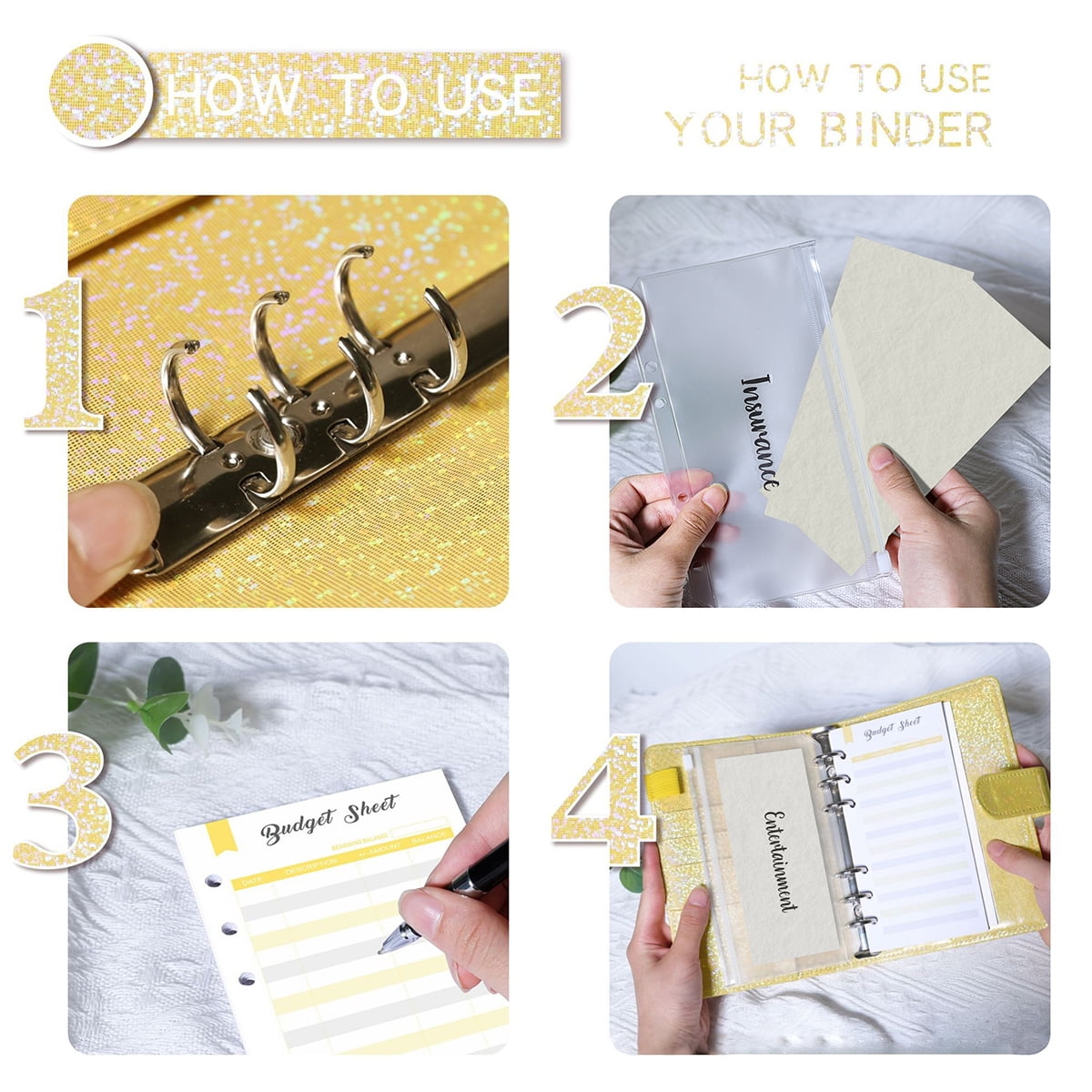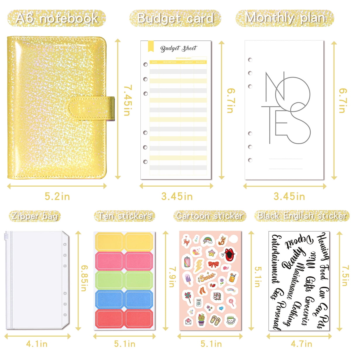 [Notebook Binder Ring] The binder fixing rings are made of durable stainless steel with a bright surface and strong quality, not easy to deform. There are 6 ring binders on the spine that hold the paper in place and prevent it from falling off. A6 binder is lightweight easy to carry, convenient for home, office, school, and travel. [12pcs Zipper Bags] The transparent zipper bags for budgeting with sealed smooth zipper to protect inner items from water and dust. They can be used for travel diaries, personal organizers, budget planners, etc. You can easily classify and manage your money according to different expenditure with the label stickers. [Keep Budget Organized] There are 12 zipper bags inside the kit, which can store bank cards, ID cards, change, banknotes, cash and other items, convenient and fast. Enough for your daily use. [Easy to Carry] Small size and light weight. It won’t take up too much space for you, easy to carry. You can put it in your handbag, backpack, suitcase, desk, drawer, convenient for home, office, school, and travel, wherever you need it. It is a good choice for work notebook, women’s diary or student notebook.Detailed description:
