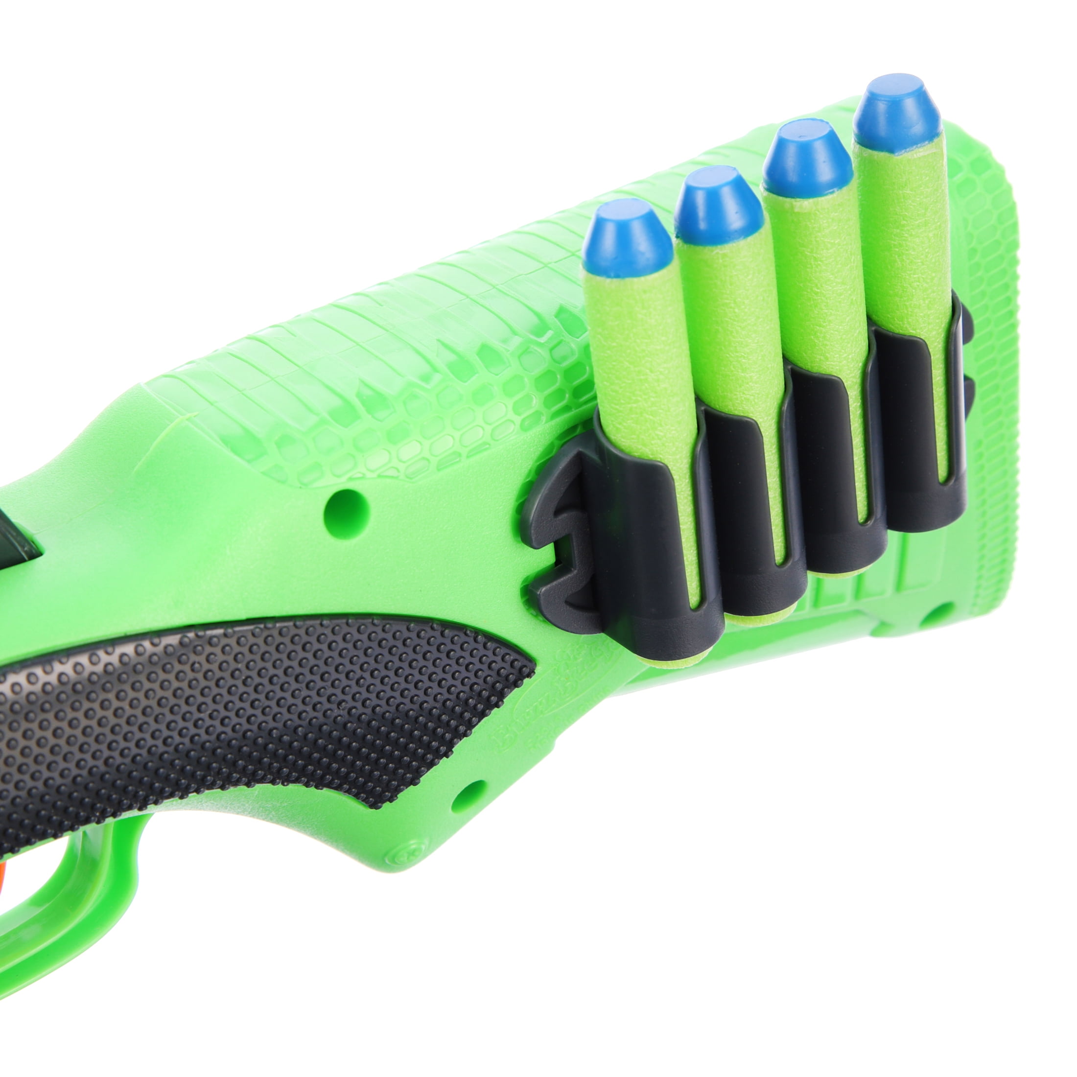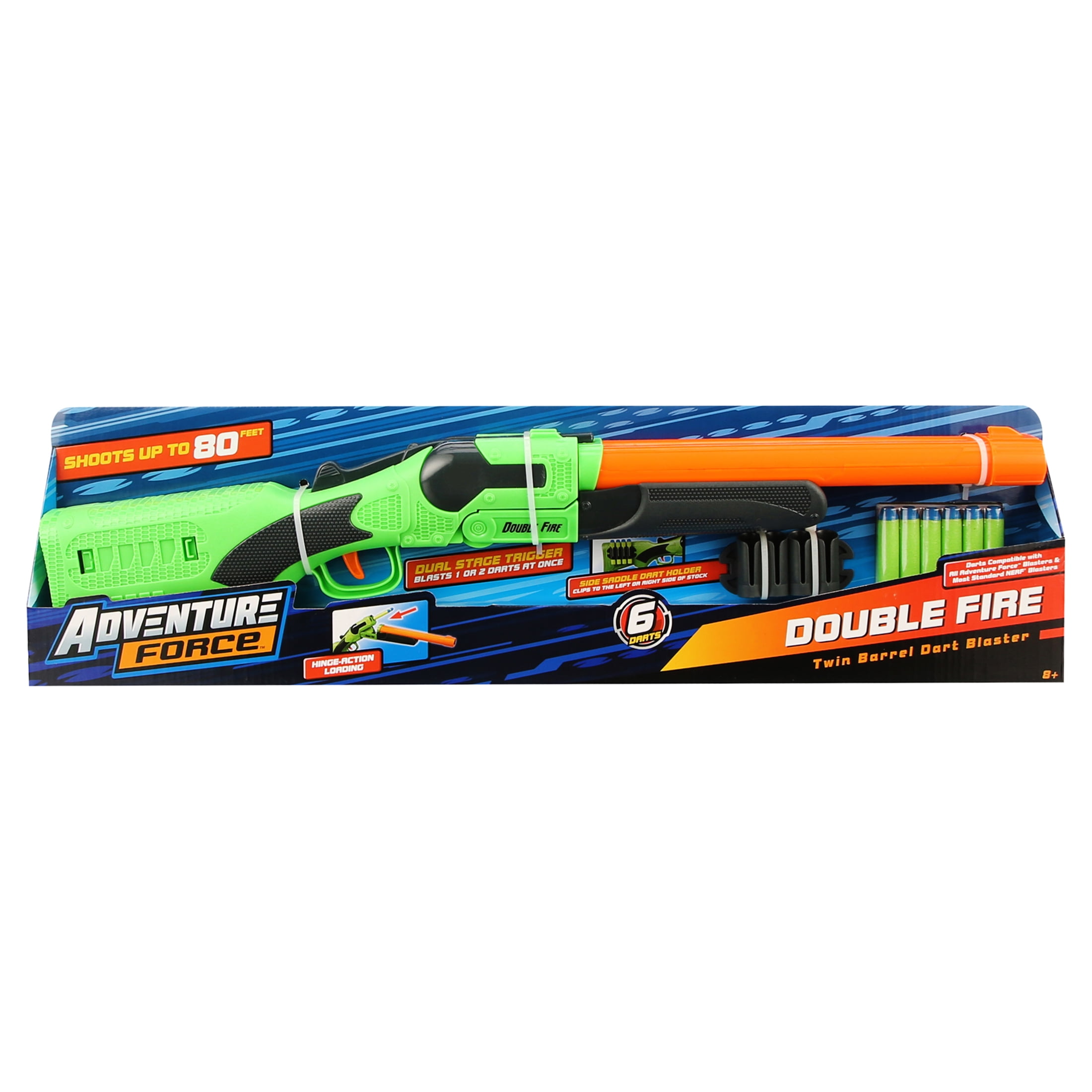 Adventure Force Double Fire by Buzz Bee Toys is a twin barrel dart blaster that features hinge action loading. Open up you blaster and insert you darts; you are loaded and ready to launch yous darts at you target. This blaster has a dual stage trigger: pull trigger to launch one dart and pull the trigger all the way to launch the second dart. The stock has an attachment so that you can add a side saddle dart holder to either side for extra ammo. Darts compatible with all Adventure Force Blasters and most standard NERF Blasters.