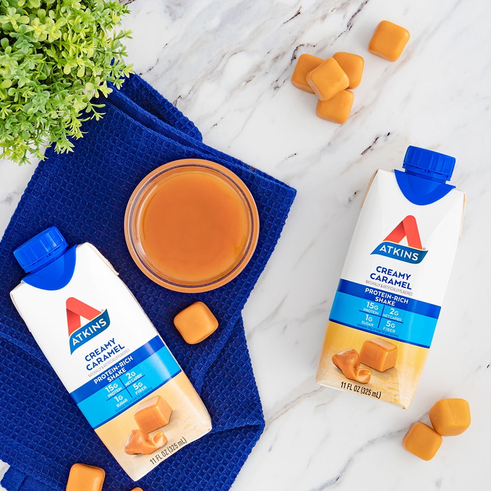 Enjoy Atkins Creamy Caramel Energy Shake! Each shake contains 15g of protein, 3g net carbs, 1g of sugar and 10g of fiber. Our energy shakes are a good source of B Vitamins, provide steady energy, and can even be used as a meal replacement to keep you going throughout your day. The Atkins Lifestyle – The Atkins Diet and Lifestyle is the original leading low-carb plan that provides effective and balanced weight loss by limiting carbs and sugar to help the body burn fat for fuel and keep your energy steady. Over 80 published clinical studies support that the science behind the principles of the Atkins Diet produces effective weight loss and long-term health benefits. Say goodbye to counting calories and say hello to today’s Atkins. Bars to feed your hunger whenever it hits– Atkins Shakes are perfect for a quick meal replacement. Stick with your low carb lifestyle without sacrificing on taste.CREAMY CARAMEL ENERGY SHAKE. This is today’s Atkins. This rich and creamy caramel flavor shake satisfies your hunger.