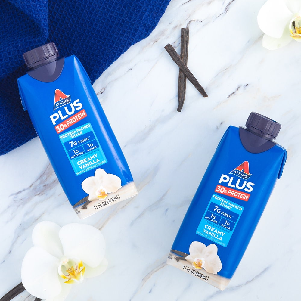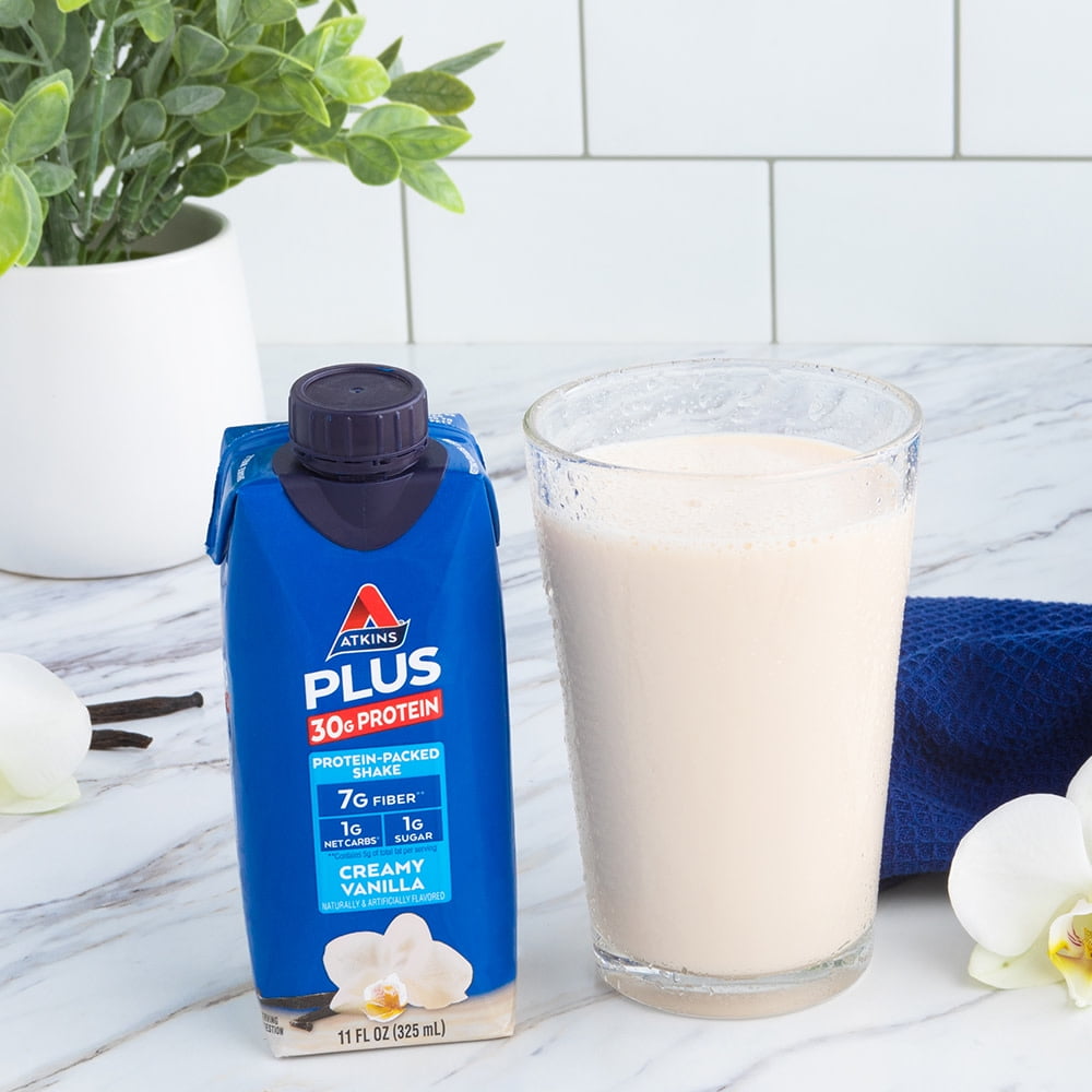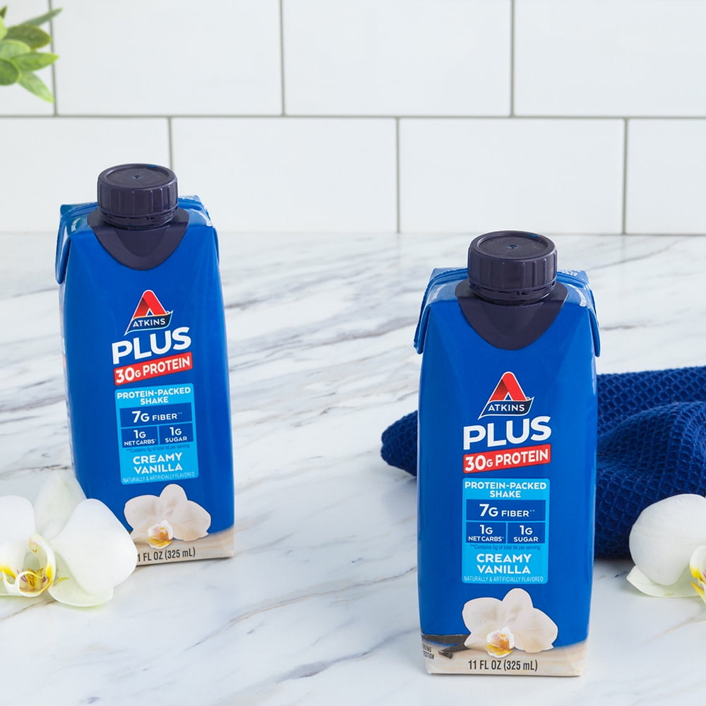 Enjoy New Atkins Plus with Protein and Fiber! Each delicious Creamy Vanilla Shake is packed with 30g of high-quality dairy protein, 7g of fiber and 20 vitamins and minerals. Atkins Plus shakes give you steady energy throughout the day, so they are the perfect meal replacement or complement to your workout routine. With 1g net carbs and 1g of sugar, they will satisfy your hunger while keeping you on track. Atkins PLUS Protein & Fiber Creamy Vanilla Shake, 11 fl oz, 12-Count. The Atkins Lifestyle – The Atkins Diet and Lifestyle is the original leading low-carb plan that provides quick, effective, and balanced weight loss my limiting carbs and sugar to help the body burn fat for fuel and keep your energy steady. Over 80 published clinical studies support that the science behind the principles of the Atkins Diet produces effective weight loss and long-term health benefits. Say goodbye to counting calories and say hello to today’s Atkins. Shakes to keep you on track any time of day – Atkins Shakes are rich & creamy and filled with essential vitamins and minerals to keep you feeling satisfied throughout the day. Our creamy shakes make for the perfect meal or snack with protein, calcium in every sip.