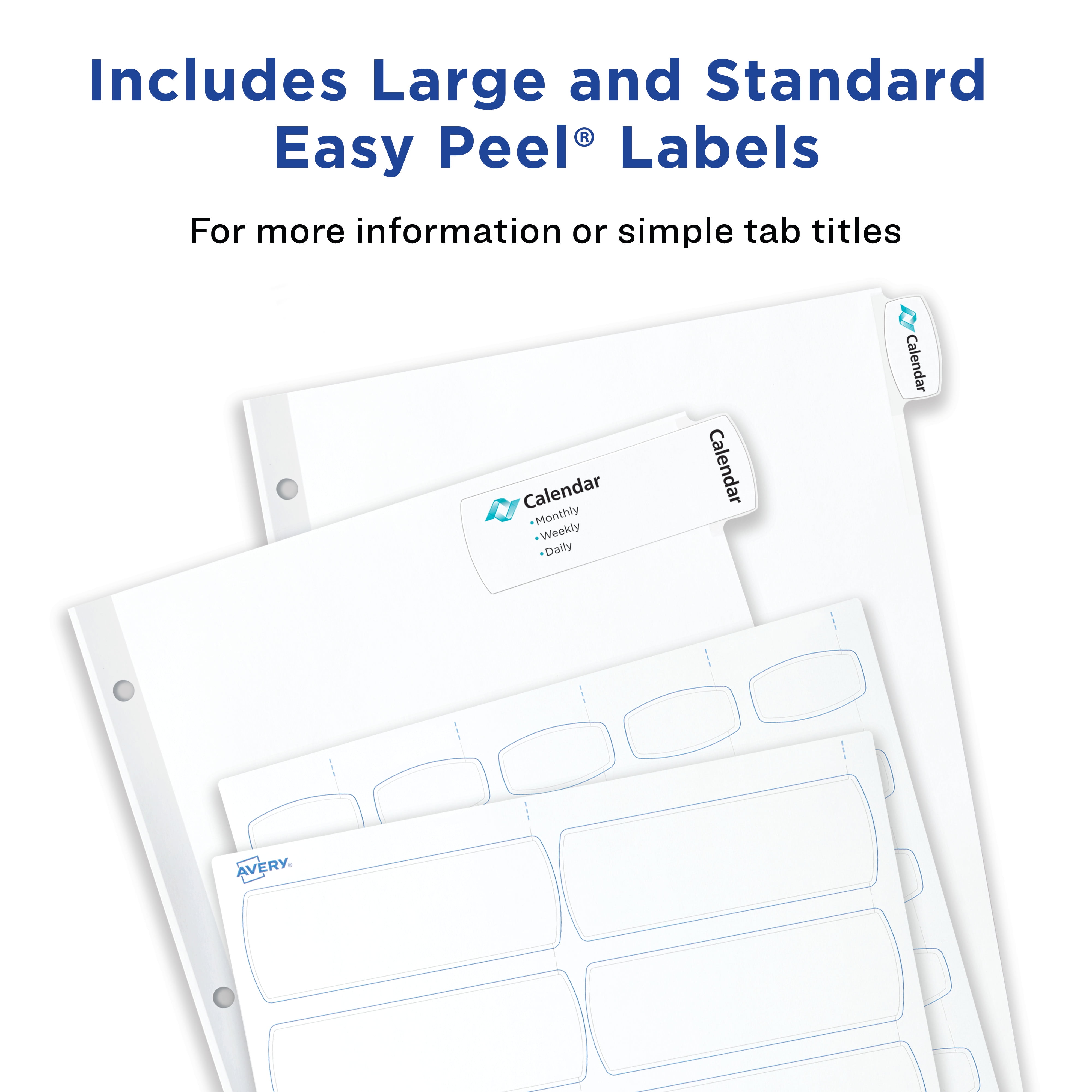 Organize your documents quickly and easily with this 8-tab set of Avery big tab dividers with large, arched labels. The larger labels extend the printable area from the tab onto the divider to provide extra space for more information, logos, images and more. Another set of standard-sized divider tab labels are also included for simple tab titles. Just bend back the label sheet to reveal the pop-up edges of each tab, peel each label and then apply. The divider tab labels are compatible with both laser and inkjet printers. The dividers are made with FSC-certified paper. Each divider is reinforced around the binder ring holes and tabs to last longer than basic dividers.