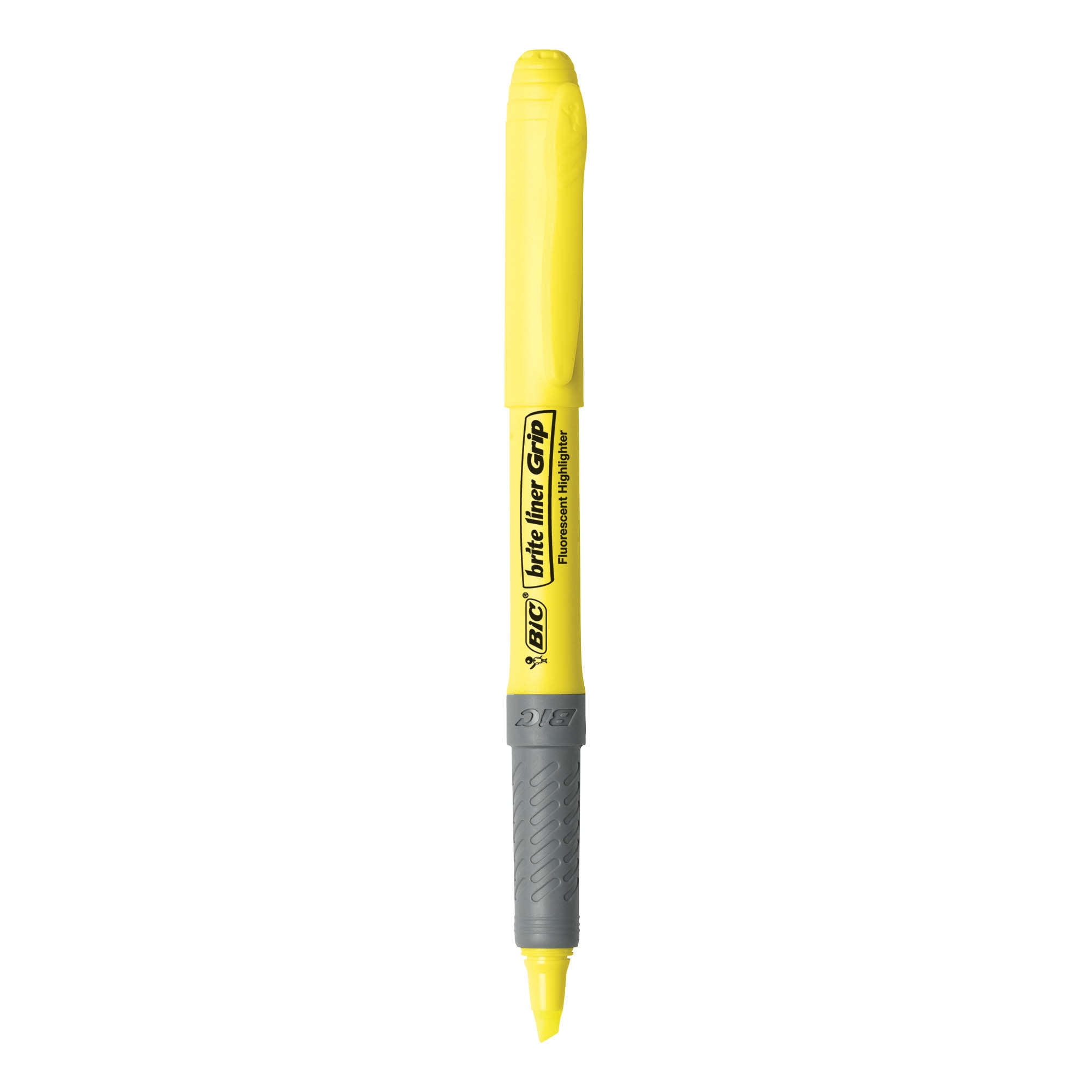 With the BIC Brite Liner Grip Highlighter, you can easily underline, emphasize, and organize your notes, textbooks, and files. These ACMI-approved highlighters feature a versatile chisel tip, so you can create both broad and fine lines, and they have vibrant fluorescent ink that stands out clearly on the page. These non-toxic highlighters won’t dry out when left uncapped for up to eight hours. These highlighters have a textured rubber grip for comfort and a convenient pocket clip that makes them easy to carry anywhere. This pack contains five yellow highlighters.