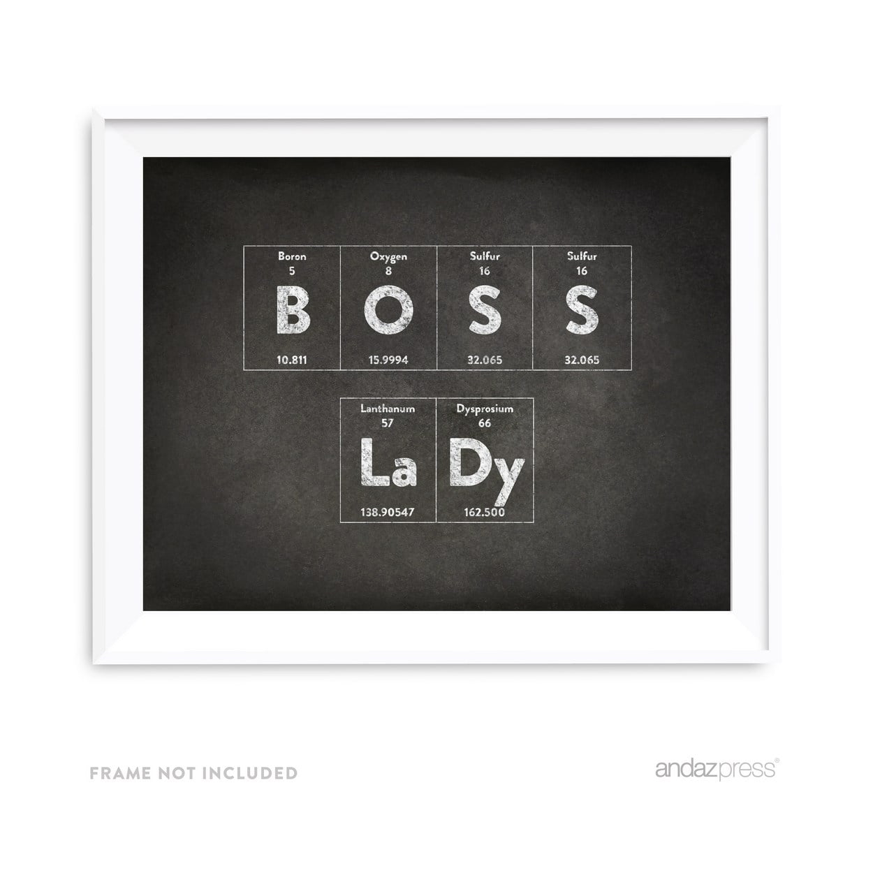 Includes: 1 periodic table chalkboard wall art print for home and office decor. Frame sold separately, not included Periodic Table Wall Art Sign Size: 8.5inch x 11inch. Properties: Matte finish. Singlesided professional high resolution print on heavy cardstock Digitally printed on high quality cardstock paper with bold vibrant colors. Actual colors may vary from the colors on your screen due to different monitor settings Exclusively designed by Andaz Press. Made in the USA. All images and designs are copyrighted © by Andaz PressLooking for fun and creative chalkboard wall art gifts? Check out our huge selection of geeky and nerdy periodic table wall art décor in vintage chalkboard style. Our cool chalkboard periodic table wall prints are ideal for a child’s room, master bedroom, office, or family room. This collection of high quality chalkboard periodic table prints is unframed, so you can customize as you please. Create an eye-catching backdrop in your home office or family room with our nerdy periodic table unframed prints.