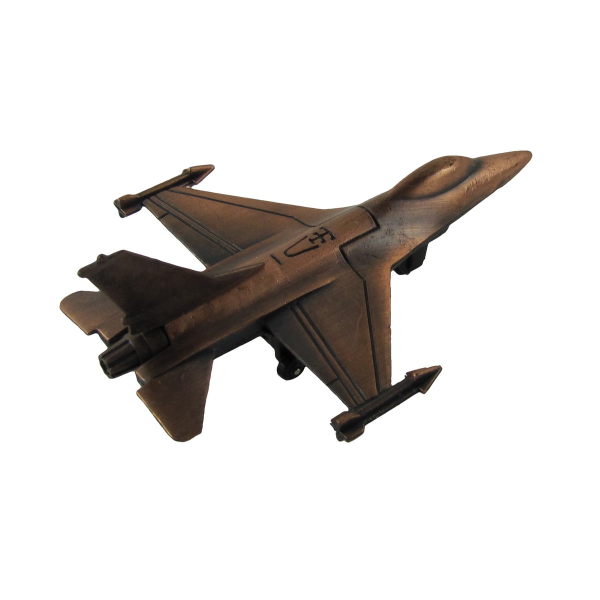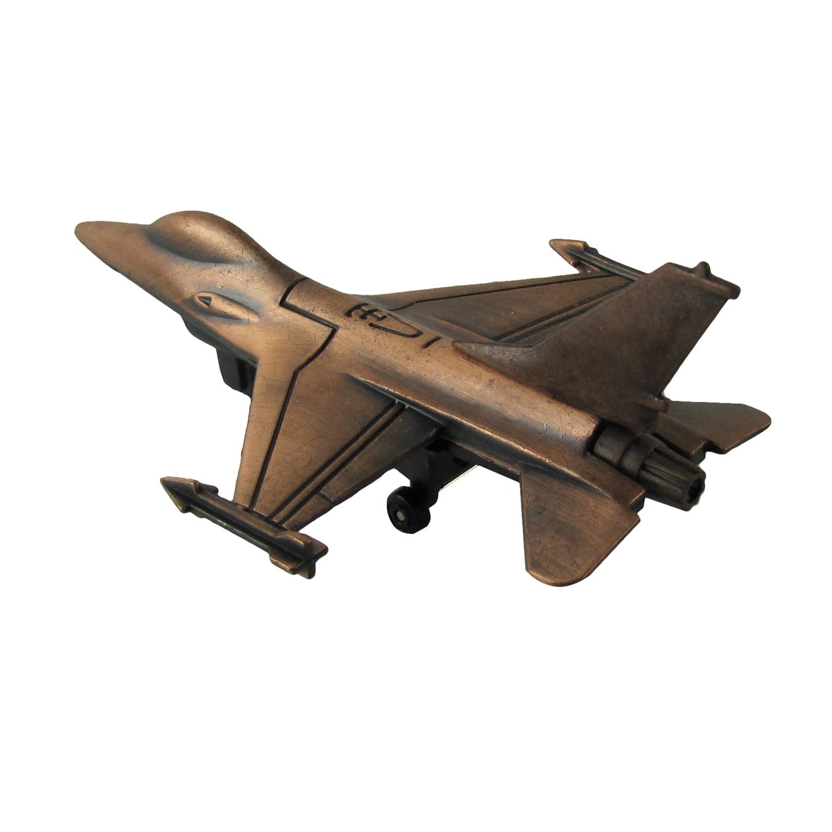 - Mini F-16 model features moving wheels, accurate detailing, and a bronze finish