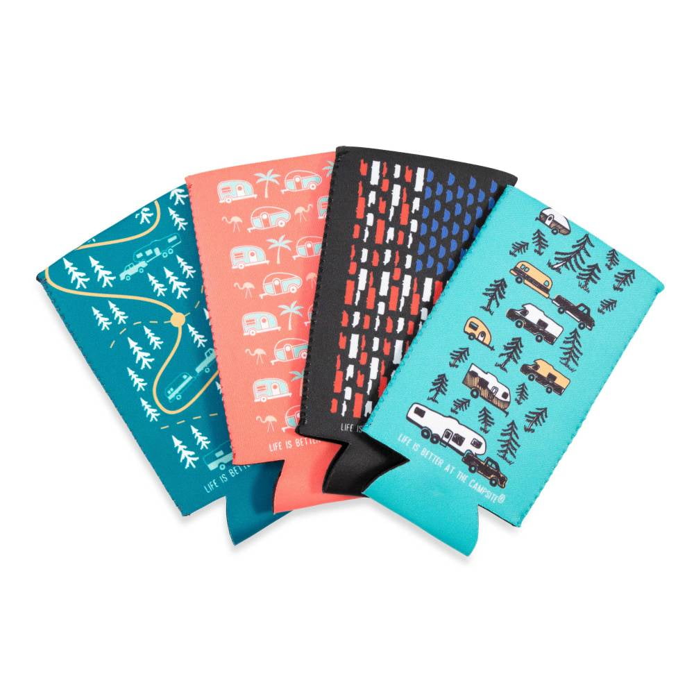Camco’s Life is Better at the Campsite Skinny Can Sleeves keep your drinks cold while keeping your hands warm and free of condensation. The sleeves are made of soft, resilient neoprene that is easy to grip. Designed for skinny, tall cans. Includes (4) unique RV-themed print designs—perfect for RV enthusiasts. Model#: 53309; Color: Multicolor; Material: Neoprene
