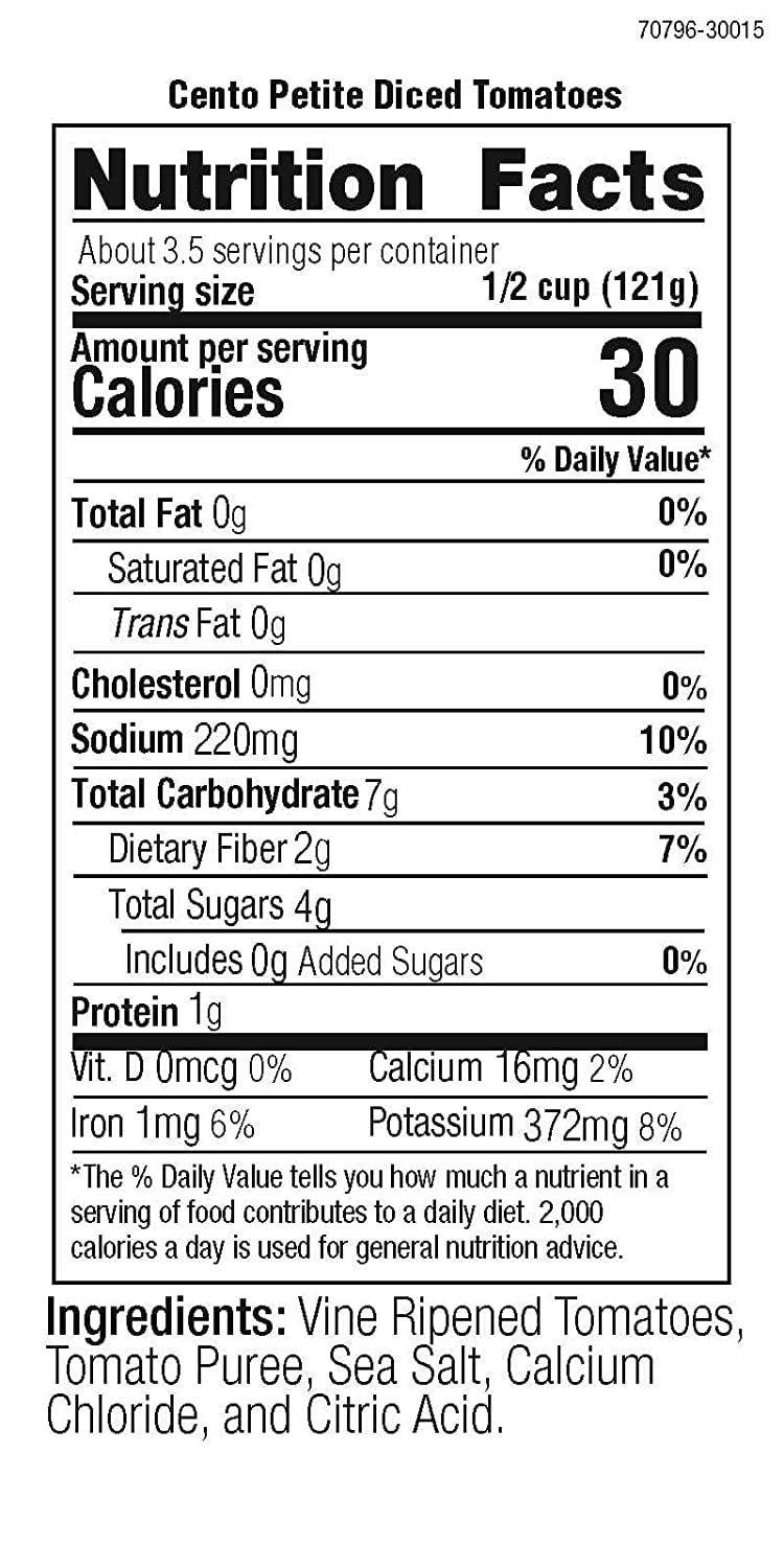 Add a distinct flavor to your pasta, pizza sauces, stews and salsas with these Cento Petite Diced Tomatoes. They’re a staple in many Italian recipes. These freshly packed, red ripe tomatoes capture that straight-from-the-garden taste. They are naturally low in calories and provide a healthy source of dietary fiber, vitamins A and C, calcium and iron. Offered in a 15 oz can, these diced tomatoes contain zero cholesterol and trans fat.