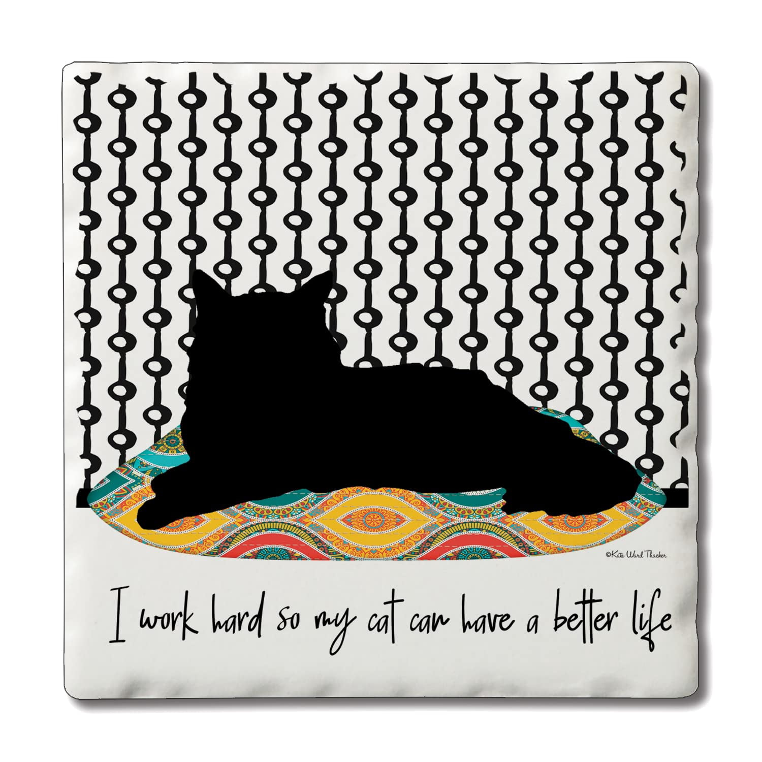 CounterArt "Better Life For My Cat" Single Absorbent Stone Tumbled Tile Coaster. Made in the USA of absorbent stone to absorb excess condensation from beverages. Cork backing protects your surfaces from scratches and stains. Coaster measures 4 inch by 4 inch allowing for a larger glass or cup to be placed on them. This Single Coaster fits perfectly in a plant or basket to be given to friends and family. Give as a hostess gift or keep for yourself. Look for coordinating CounterArt Single Tile Coasters to complete your own set.