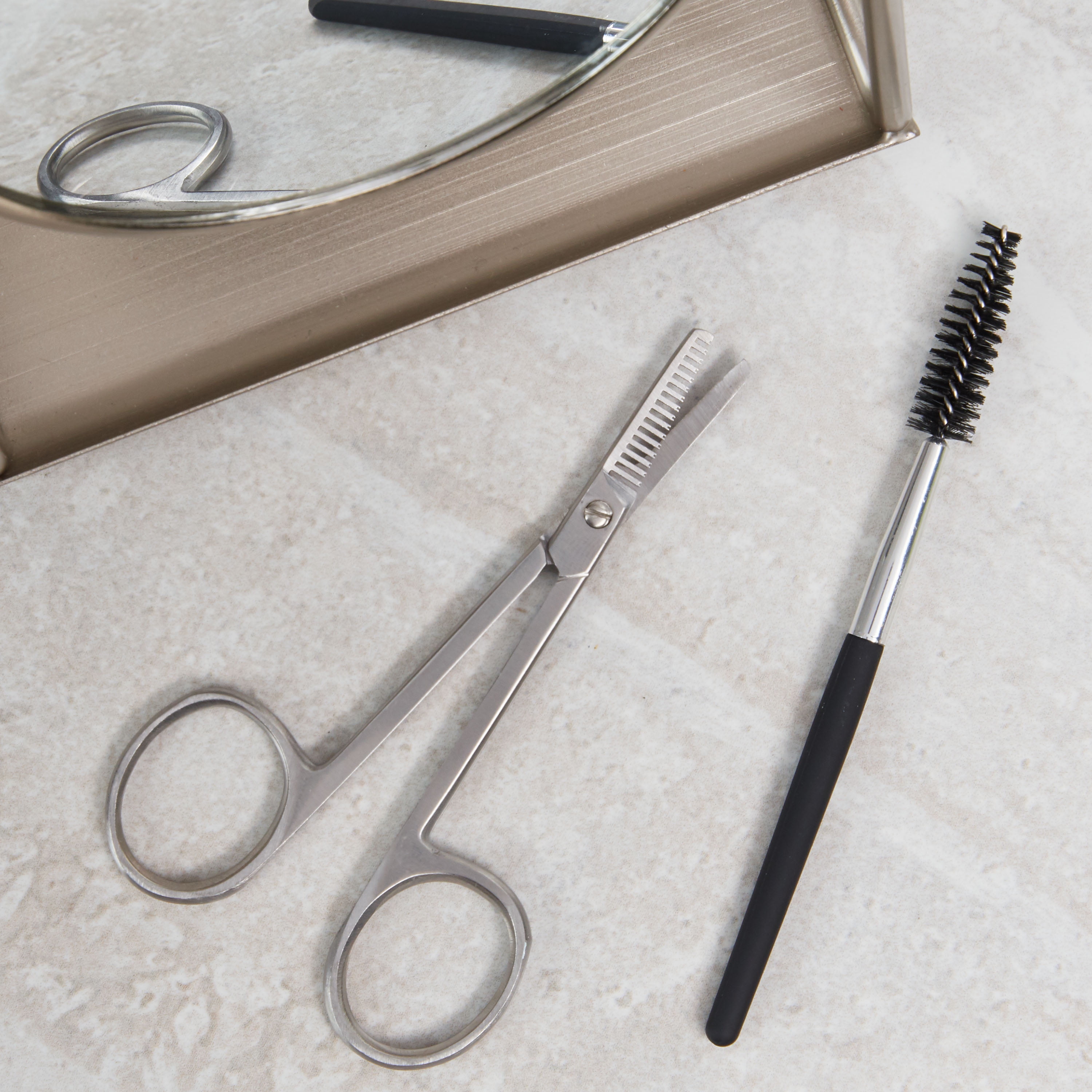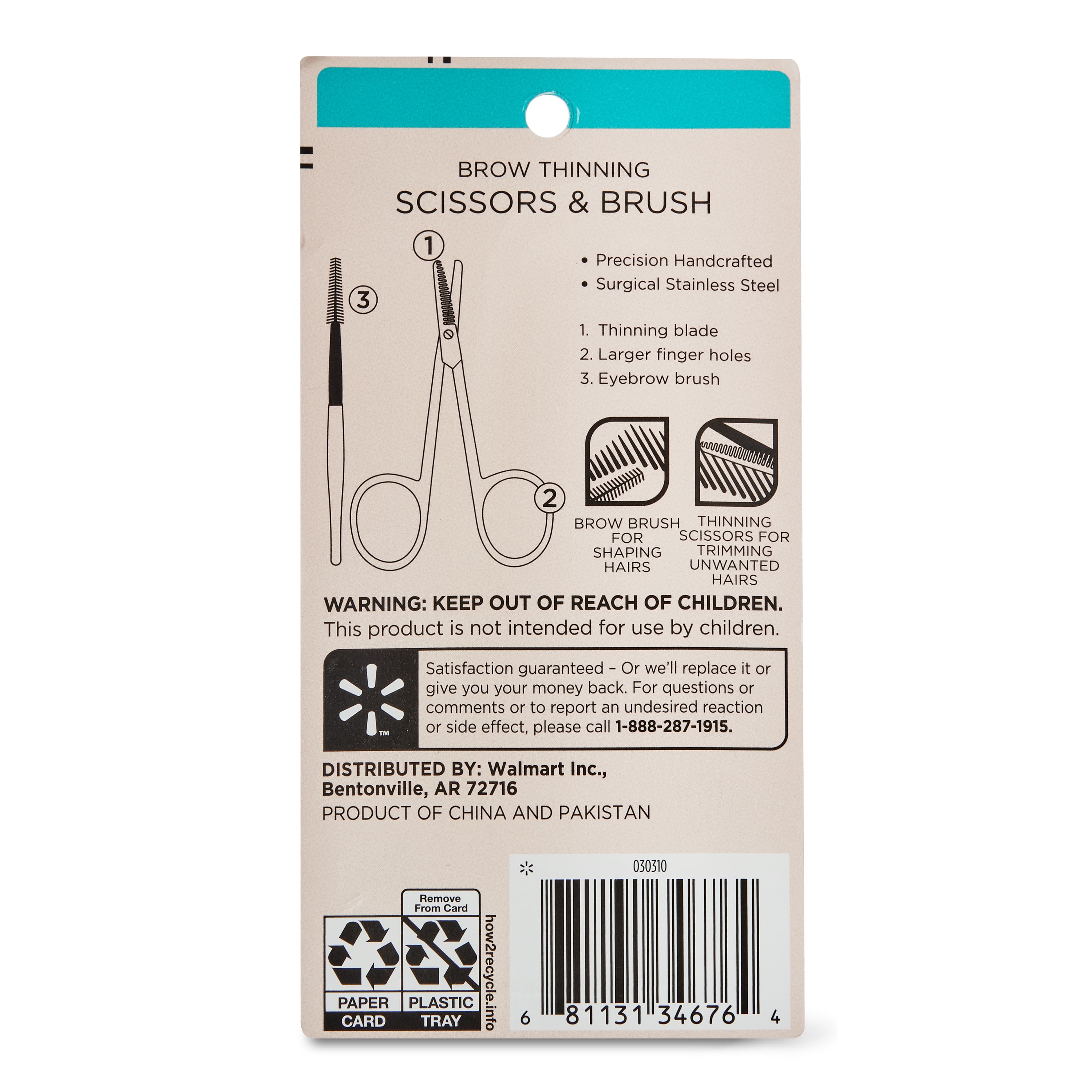 Equate Beauty Brow Thinning Scissors and Brush are specifically designed to help you keep your brows looking great. This convenient combo pack features a portable brush for shaping hairs and a pair of scissors for trimming. The handcrafted scissors are equipped with sharp blades, a stylish handle, and larger finger holes to provide you with optimal comfort and precision and are perfect for trimming unwanted hairs, while the brush allows you to perfectly shape the hairs.
