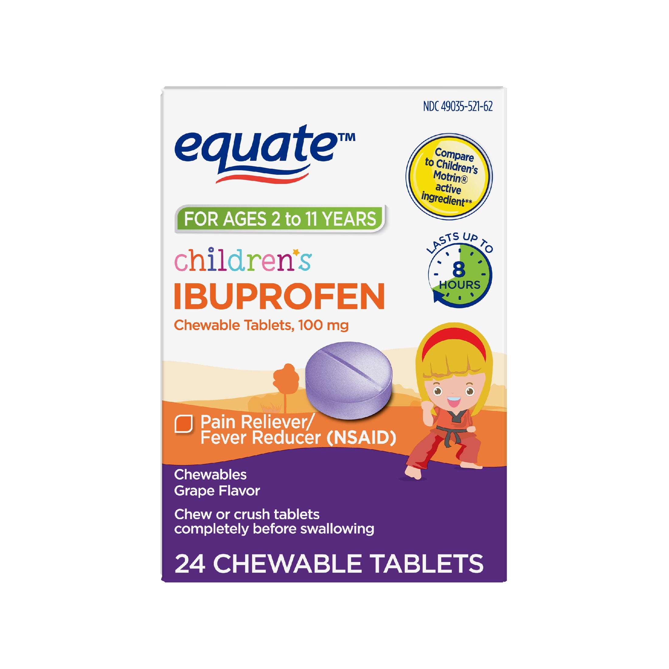 Equate Childrens Ibuprofen Chewable Tablets, 100 mg, Grape Flavor, Pain Reliever and Fever Reducer (NSAID), 24 Count