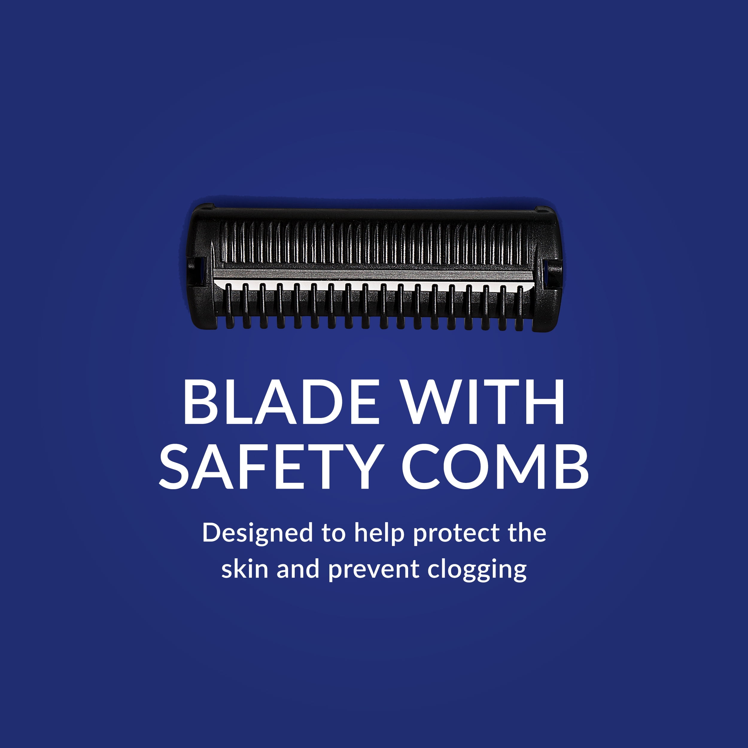 - A blade with specifically designed safety comb to help protect the skin and prevent clogging
