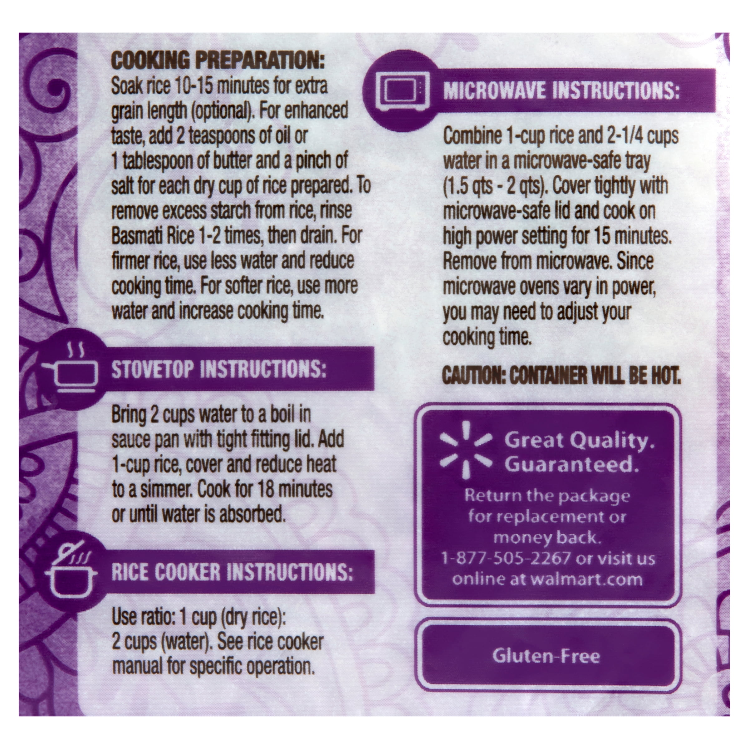No well-equipped pantry should be without a bag of Great Value Basmati Rice. This pantry staple can be enjoyed in so many ways, you’ll wonder how you ever cooked without it. Add it as a side to a roasted duck curry, spice it up with saffron or tarragon, or even make a sweet and creamy basmati rice pudding. Prepare your rice with the easy-to-read instructions conveniently located on the back of the package. You’ll love cooking in the kitchen with Great Value Basmati Rice.