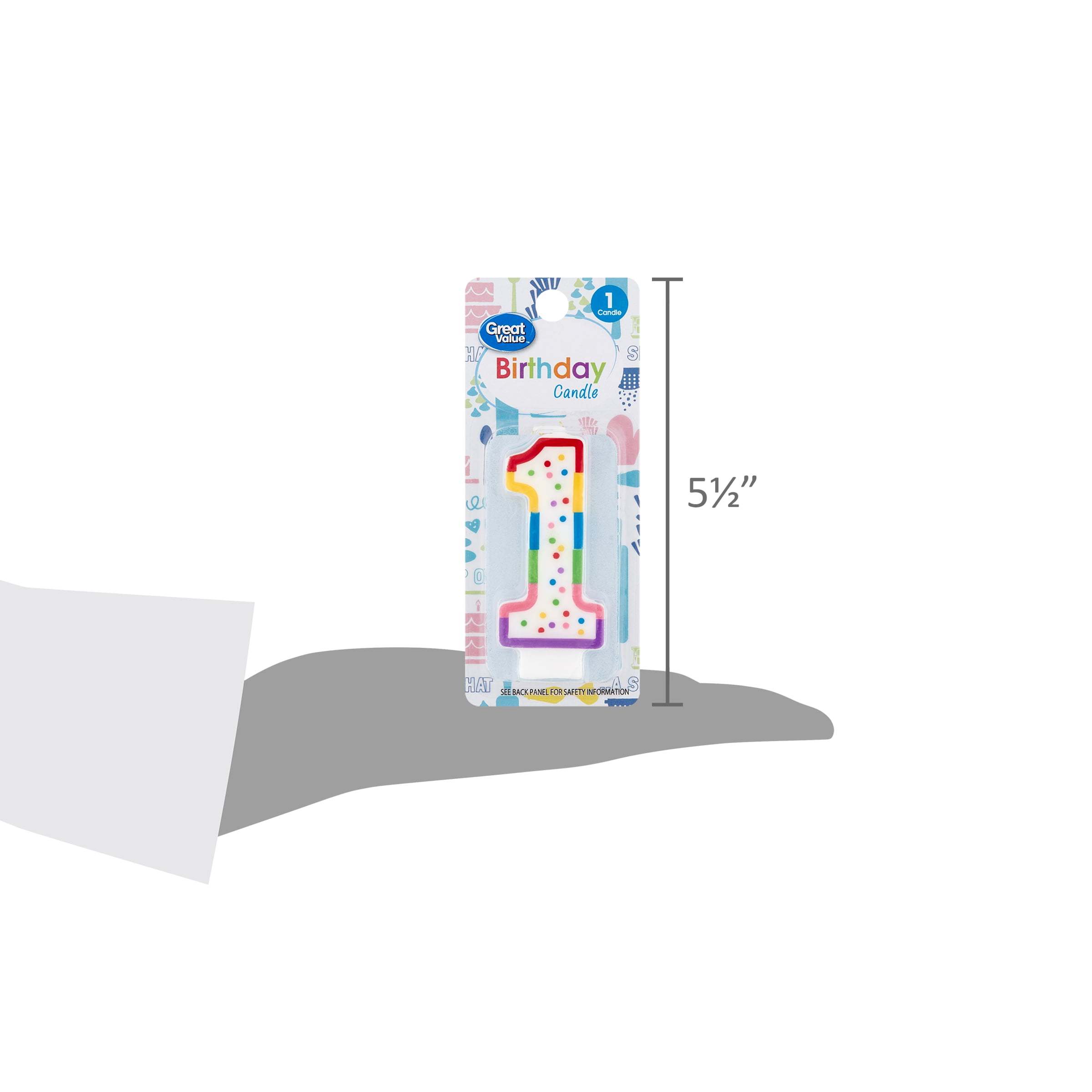 Great Value Birthday Party Number One Candle is a festive addition to cakes, cupcakes and other desserts. This vibrant candle is perfect for any occasion, whether it be a birthday, anniversary or graduation. Pair this candle with other numbered candles to create a custom age or date for any other special occasion. This pack comes with one polka dotted candle that is shaped in the numbers 1. Whether it’s 1 year or 100 years, this candle is sure to put a smile on your loved one’s face. Spruce up your next celebratory dessert with this Great Value Number "1" Birthday Party Candle.