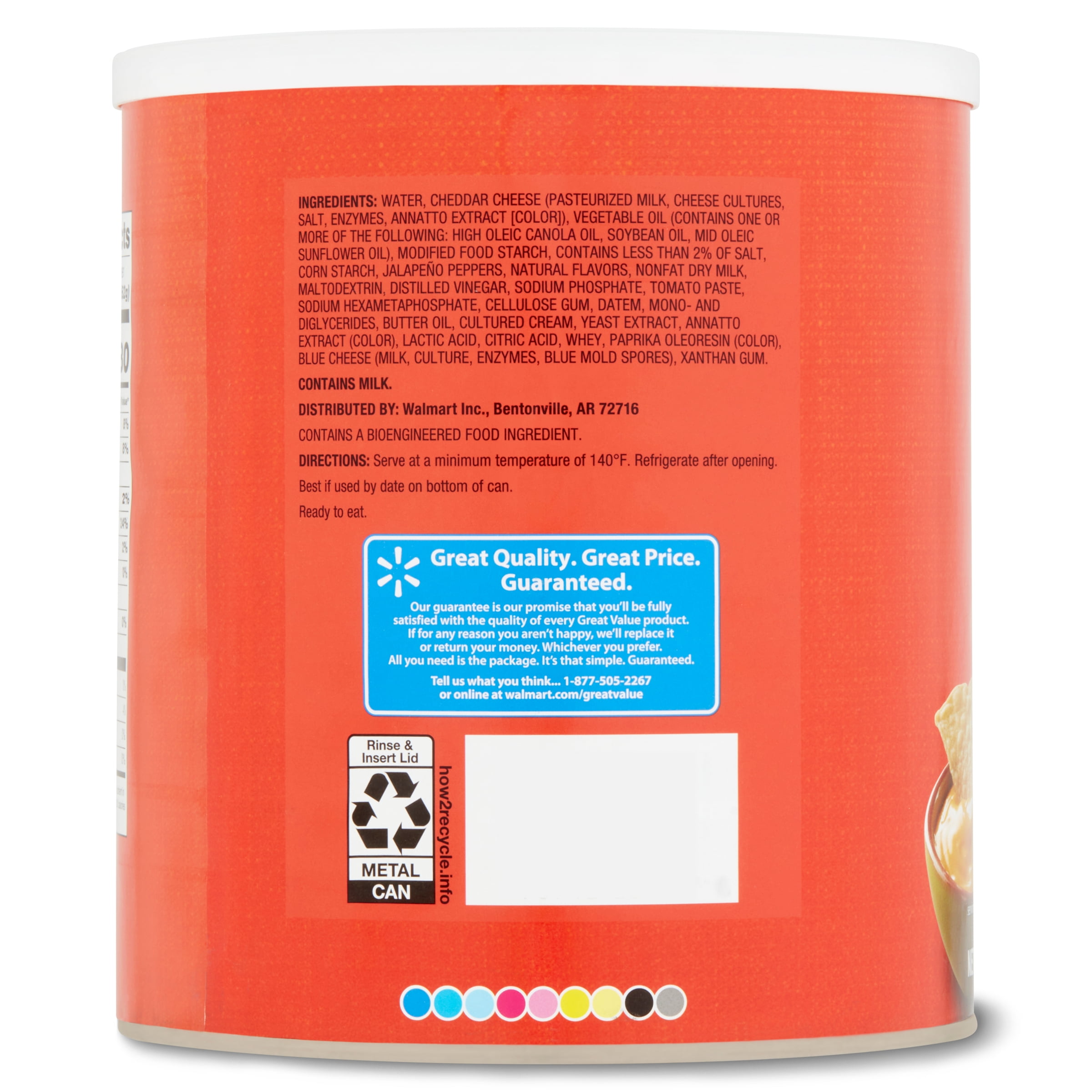 Get ready for game day with Great Value Nacho Cheese Sauce. The delicious, creamy flavor will make your nachos the hit of any party. Instantly upgrade hamburgers, hot dogs, and baked potatoes with a drizzle of cheese sauce. Combine some with cooked pasta for a quick mac and cheese, or mix it with canned chili in a slow cooker for a fantastic chili con queso dip. Everything is a little better when you add some Great Value Nacho Cheese Sauce.