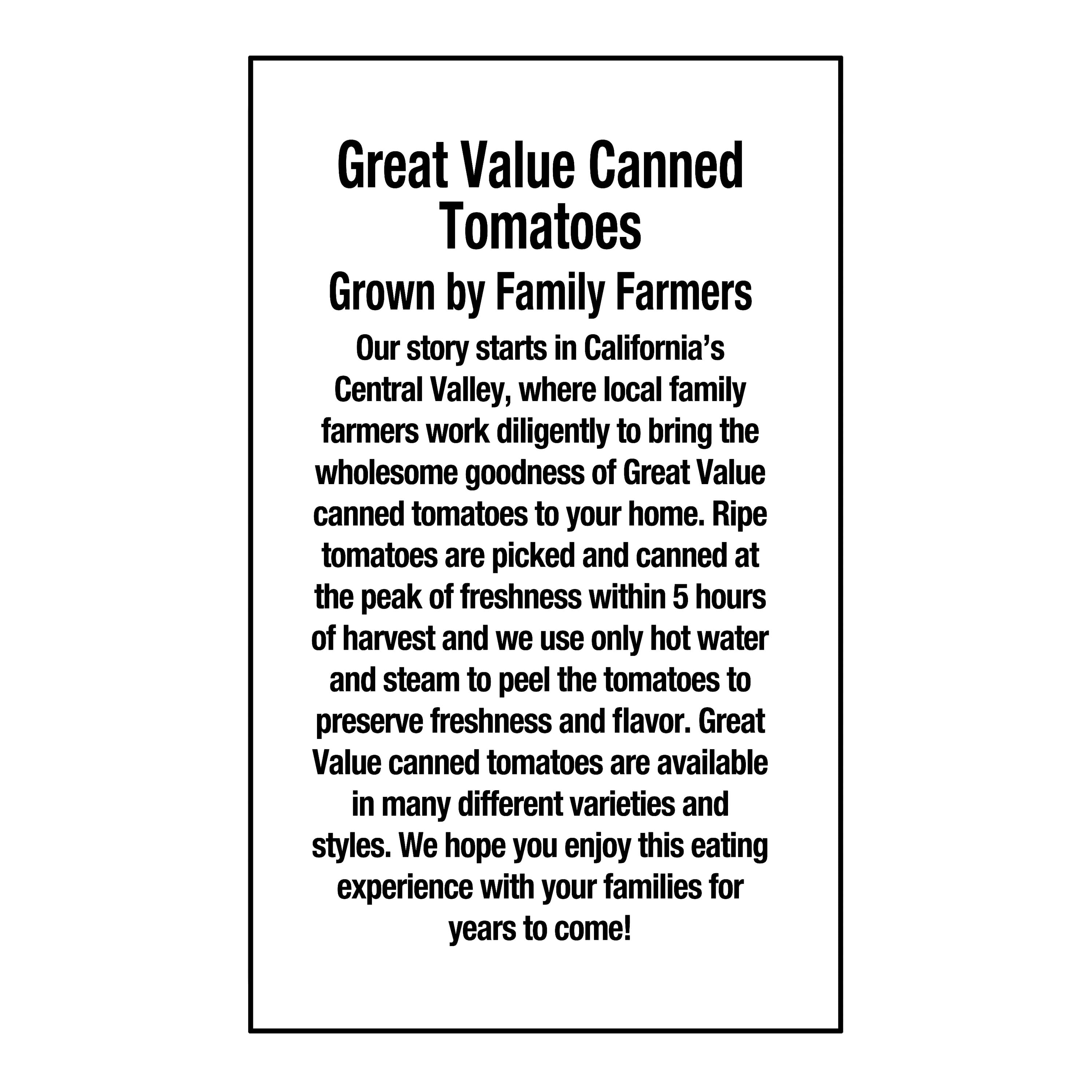 Our story starts in California’s Central Valley, where local family farmers work diligently to bring the wholesome goodness of Great Value canned tomatoes to your home. Ripe tomatoes are picked and canned at the peak of freshness within 5 hours of harvest and we use only hot water and steam to peel the tomatoes to preserve freshness and flavor. Great Value canned tomatoes are available in many different varieties and styles. We hope you enjoy this eating experience with your families for years to come!