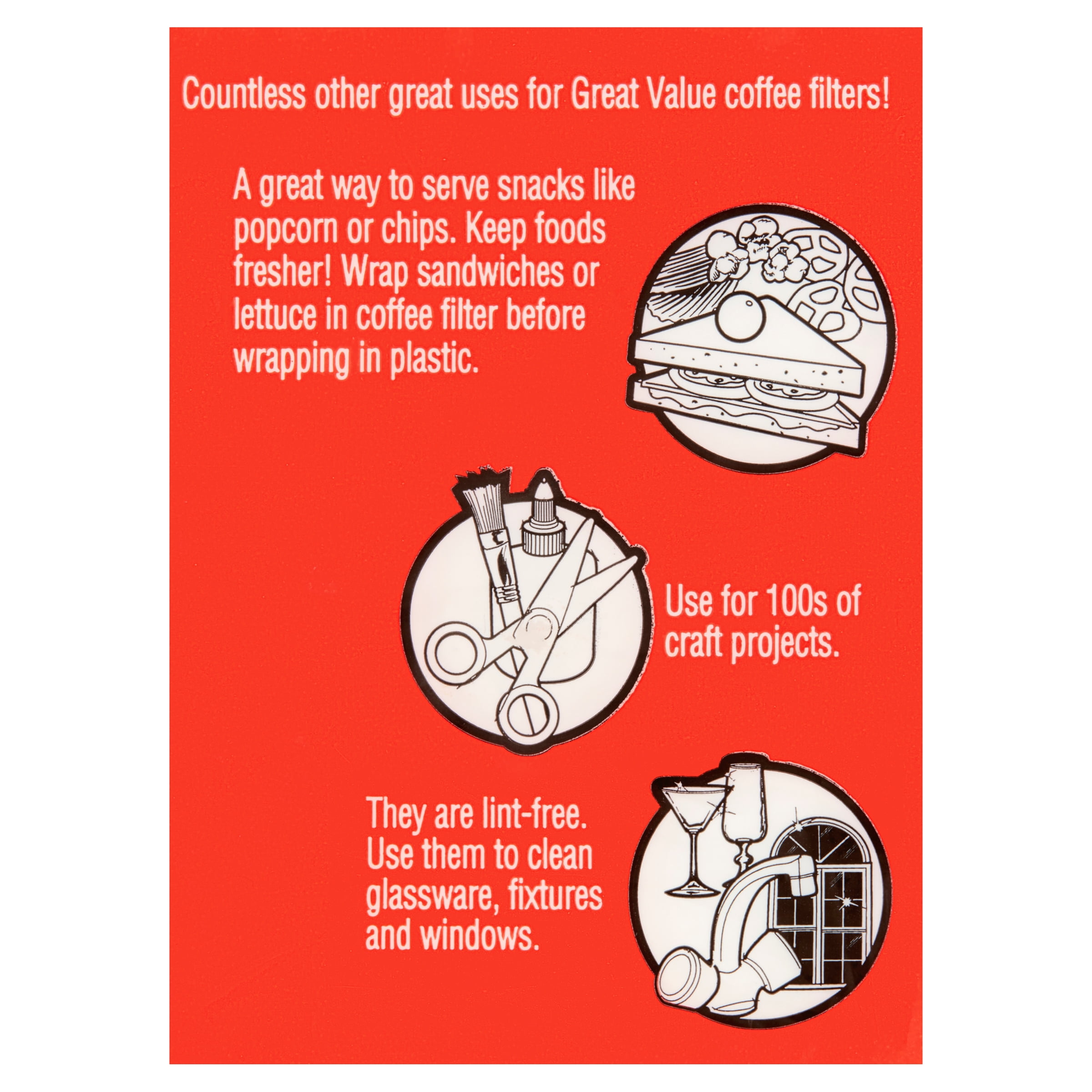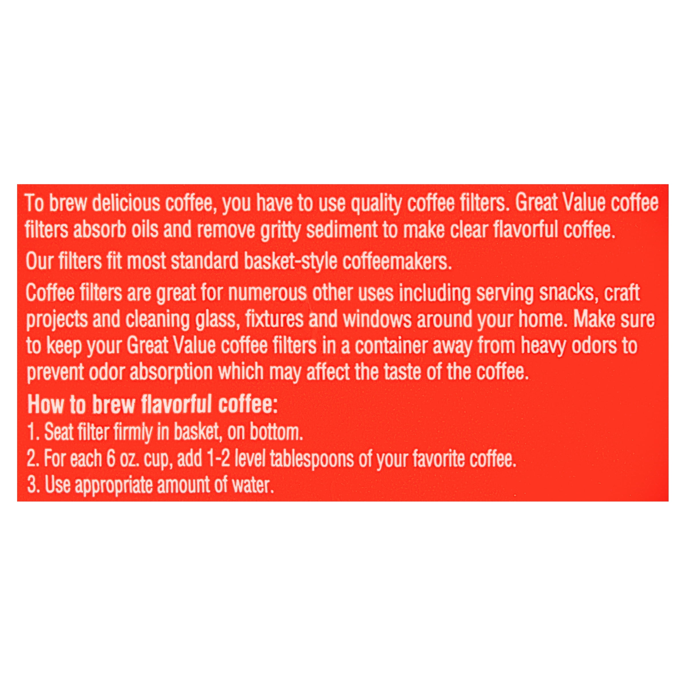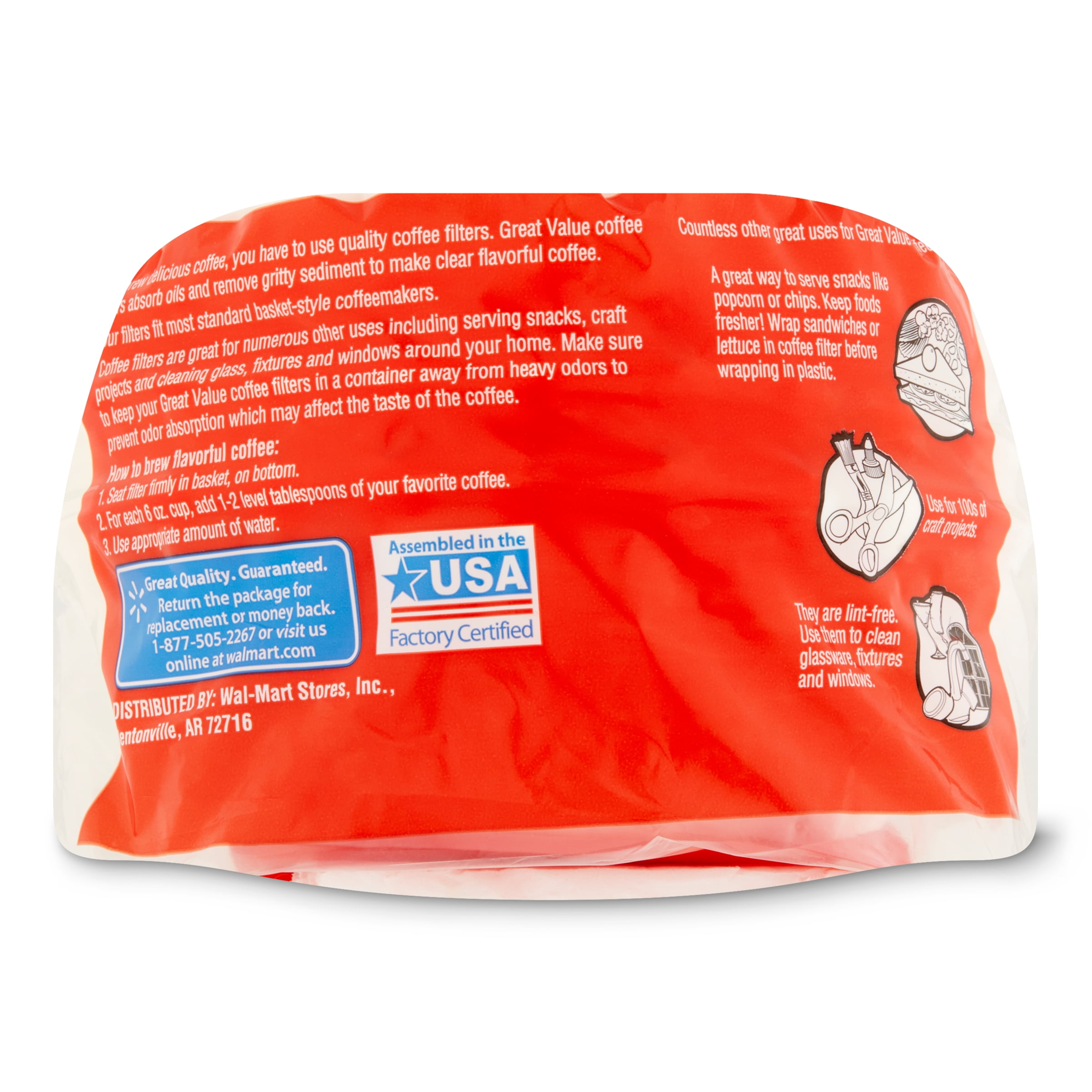 Great Value White Basket Coffee Filters are 100% natural, high-quality paper filters perfect for brewing your favorite coffee in minutes. These filters are compatible with most standard 8-12 cup basket coffee makers. Just place the filter in the filter container, add a few scoops of ground coffee, pour water into the coffee maker, and turn it on. Our coffee filters absorb oils and remove gritty sediment, so your coffee tastes clean, pure, and delicious. Coffee filters are also great for numerous other uses. Keep food fresher longer by wrapping with these filters or use a filter to portion and serve snacks like popcorn or candy. These filters are also lint-free, which makes them great for cleaning glass, mirrors, fixtures, or windows around your home. Give your day a wonderful, warm start with your favorite coffee with Great Value products that provide families with affordable, high-quality grocery and household consumable options. With our wide range of product categories spanning grocery and household consumables, we offer you a variety of products for your family’s needs. Our products are conveniently available online and in Walmart stores nationwide, allowing you to stock up and save money at the same time