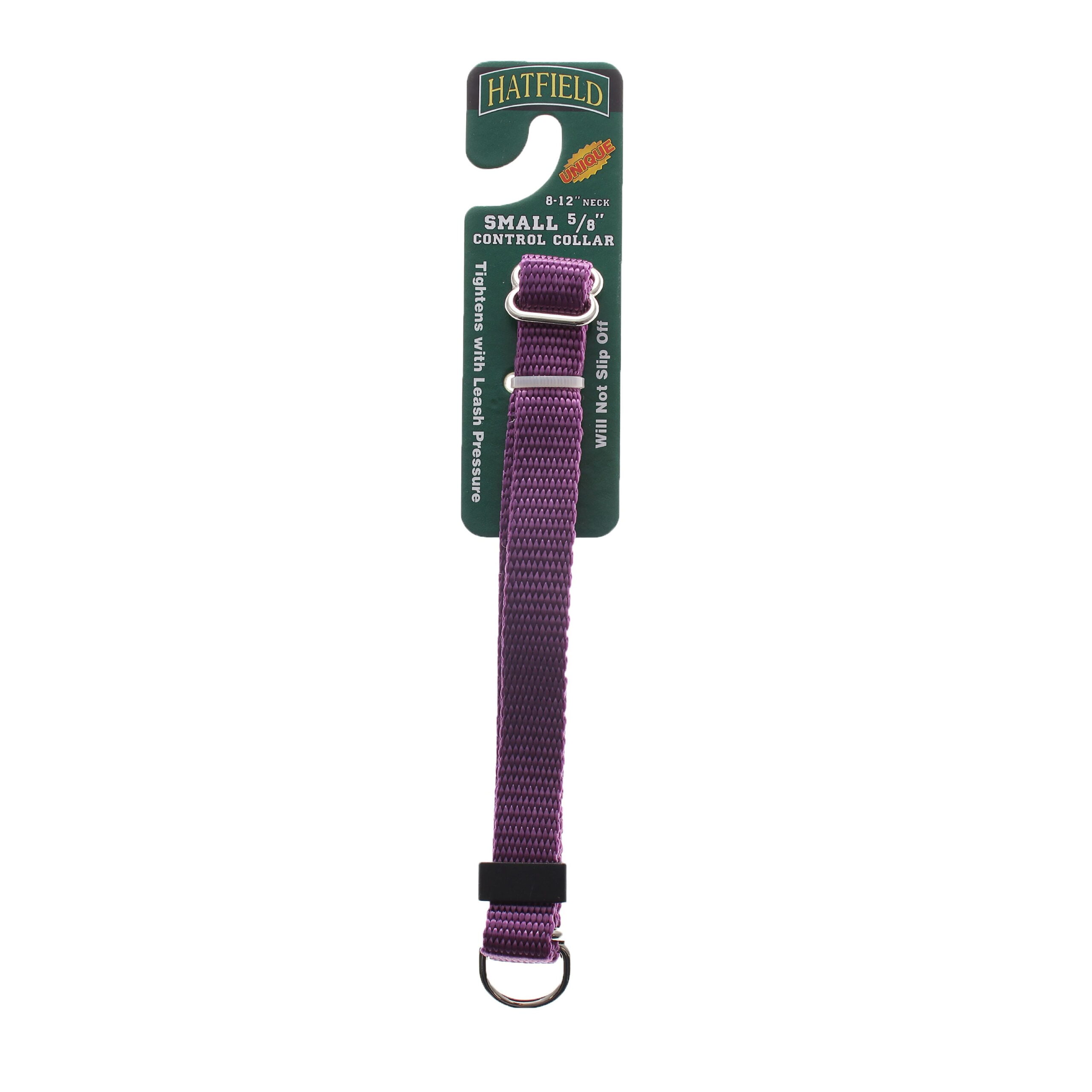 Unique "Control Collar". Tightens with pressure from leash. Will not slip off. Adjustable-grows with your dog. Not to be used as a tie out. Developed by a veterinarian.Small, Fits 8 to 12 inch neck. Purple.Tightens with pressure from leash-will NOT slip off.