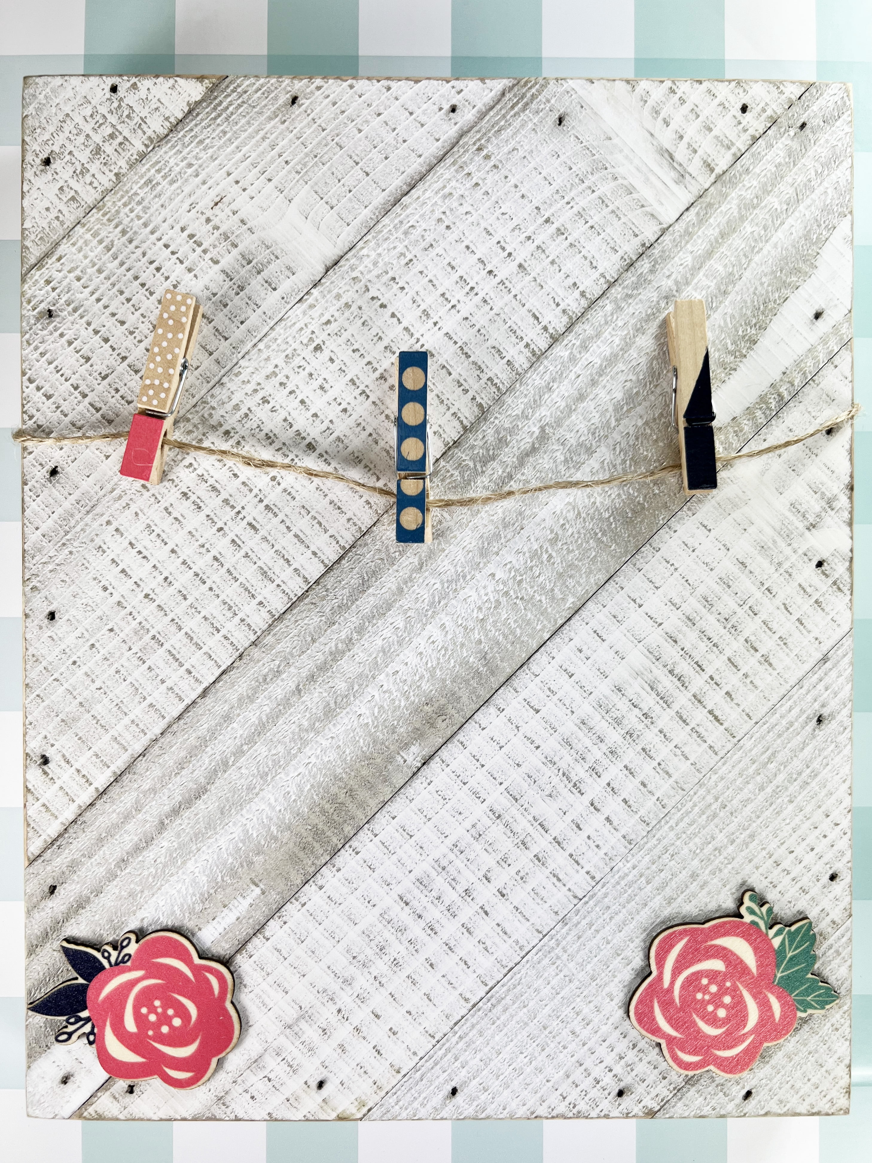 - Kit includes 10 printed clothespins; 2 wood icons and jute