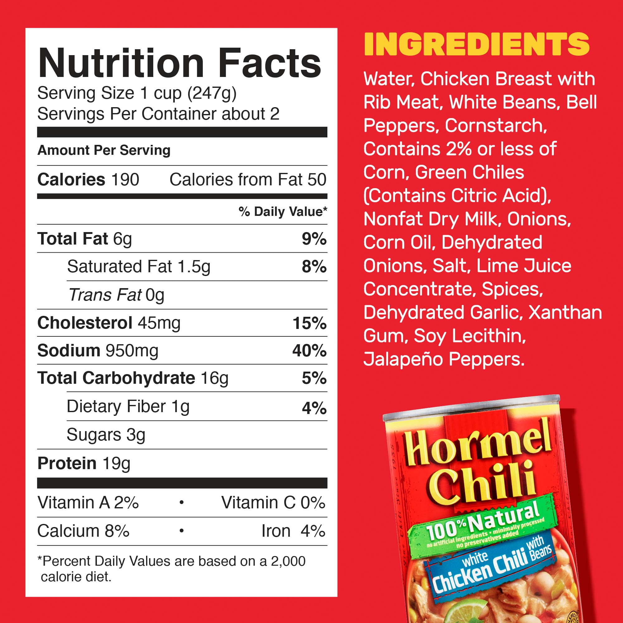 HORMEL 100% Natural* White Chicken Chili with Beans is an authentic chili recipe of tender chicken and spices. Just pop, heat, and serve for a quick, convenient meal! Works great in mac and cheese, enchiladas or stuffed bell peppers. **No wonder it’s #1 Selling Chili in America. Open up a can of HORMEL Chili and Pour On! *Minimally processed. No artificial ingredients. **Based on the latest 52-week IRI data. All trademarks, logos and images are owned by Hormel Foods Corporation, its subsidiaries and affiliates. Copyright Hormel Foods, LLC.