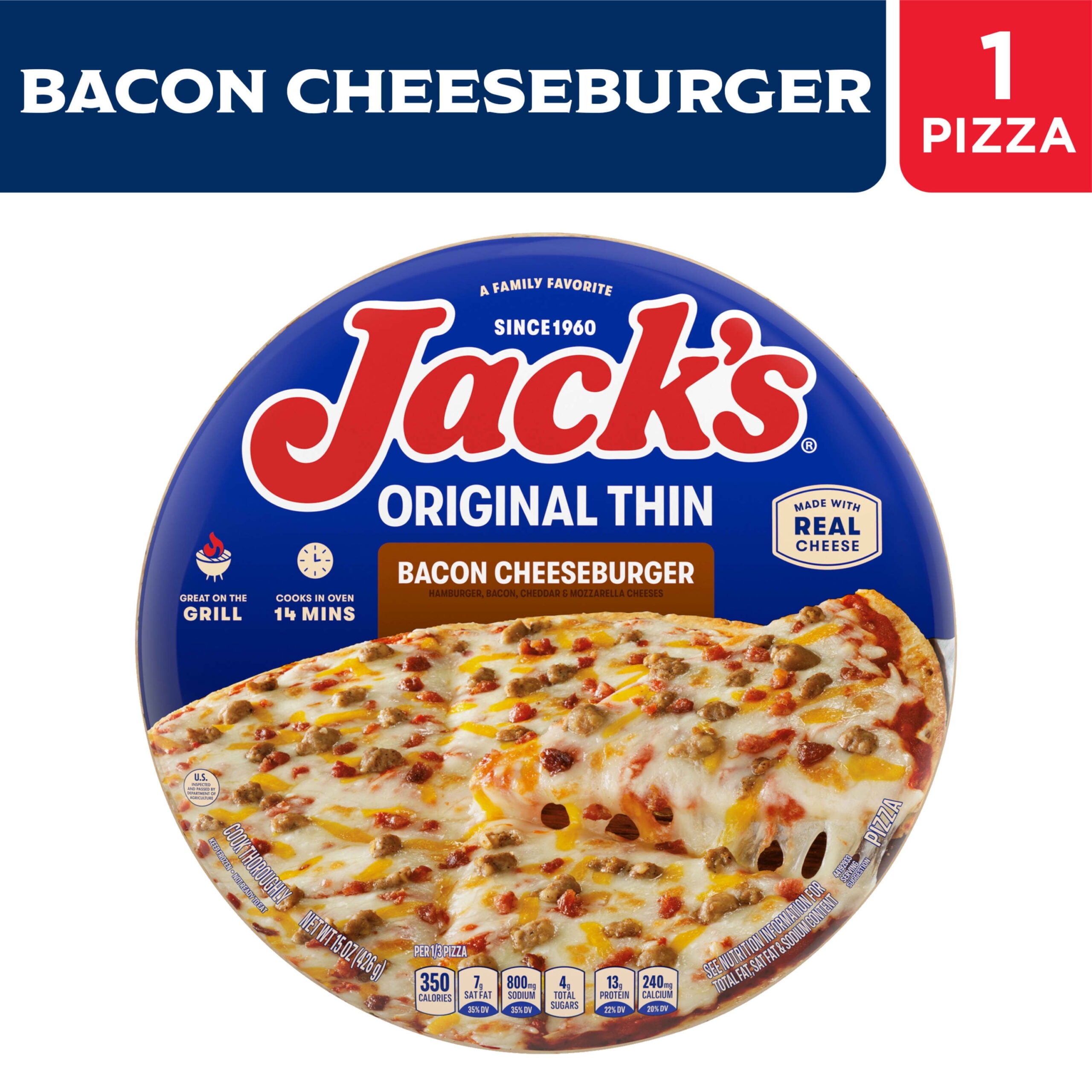 Jack’s Bacon Cheeseburger, Original Thin Crust Pizza, 15 oz (Frozen)