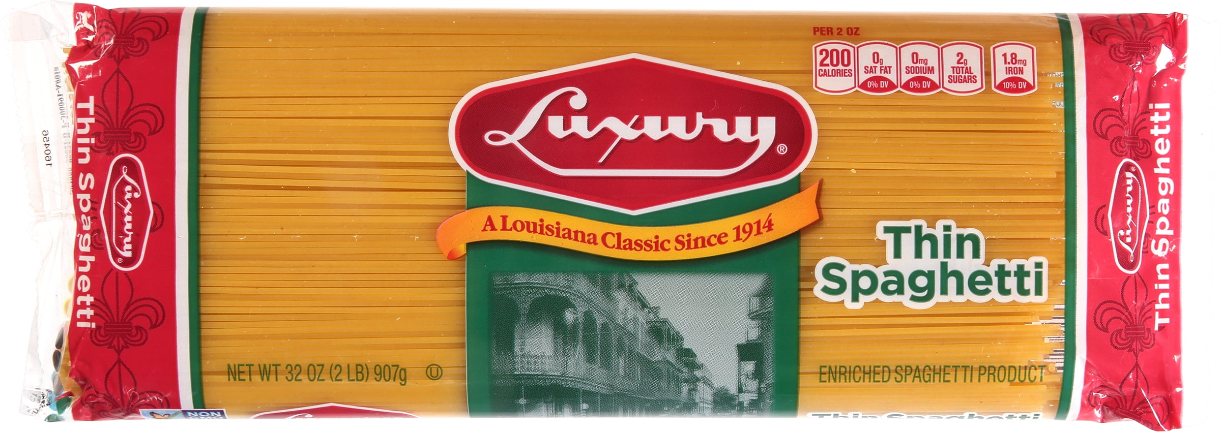 - Enriched spaghetti product. Per 2 oz: 200 calories; 0 g sat fat (0% DV); 0 mg sodium (0% DV); 2 g total sugars; 1.8 mg iron (10% DV). A Louisiana classic since 1914. The Luxury Story: Created in New Orleans in the early 1900s by an Italian immigrant family, Luxury has been making quality pasta for neighborhood families for generations. A century later, Luxury continues its commitment to delicious, homestyle Louisiana cooking. Formerly (3). luxurypasta.com. For delicious recipes and more visit luxurypasta.com. Comments or questions, please call 877-eat-pasta (877-328-7278).