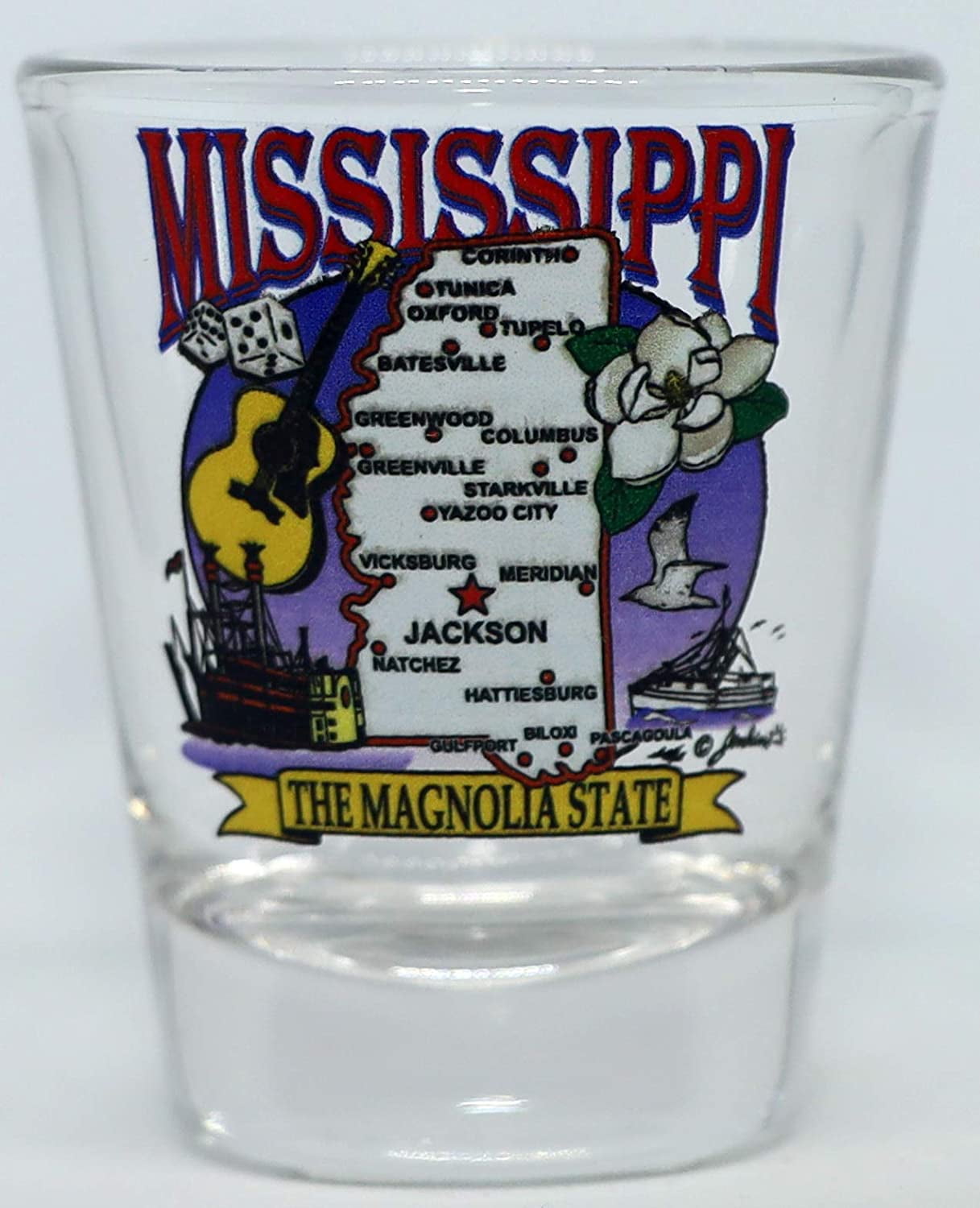 Here’s a very rare and hard to find souvenir collectible shot glass from Mississippi. It’s a 5x6cm style shot glass measuring 2.25" tall and 1.8" in diameter. It depicts a variety of scenery found in this beautiful state.Mississippi State Elements Map New Design shot glass