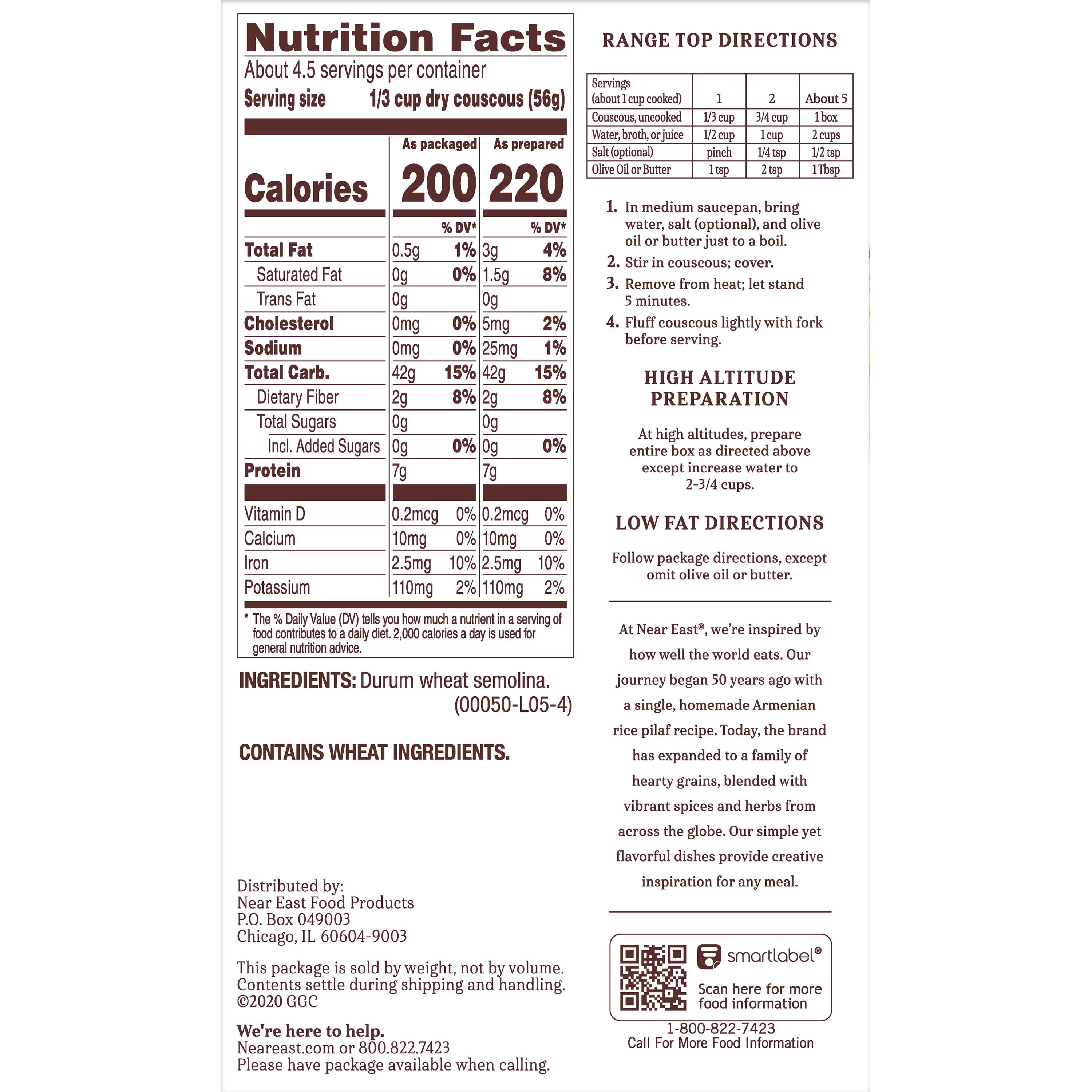 NEAR EAST COUSCOUS MIX, ORIGINAL PLAIN IS A DELICIOUS COUSCOUS FROM A LONG-ESTABLISHED COMPANY. THIS FORMULA IS QUICK AND EASY TO COOK. SIMPLY ADD THE INGREDIENTS TO A SAUCEPAN, BRING TO A BOIL, ADD THE COUSCOUS AND REMOVE FROM HEAT. AFTER FIVE MINUTES THE COUSCOUS IS READY. COUSCOUS CAN BE EATEN ALONE AS A SIDE DISH OR MIXED INTO MANY DIFFERENT RECIPES SUCH AS CASSEROLES AND SALADS, FOR ADDITIONAL FLAVOR, PROTEIN, FIBER, AND HEALTH BENEFITS. EACH BOX CONTAINS 10 OZ. OF KOSHER COUSCOUS.NEAR EAST COUSCOUS MIX, ORIGINAL PLAIN, 10 OZ.