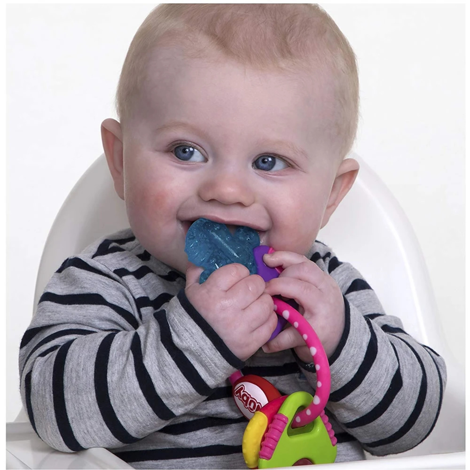 The Pink IcyBite Keys teether soother by Nuby is another innovation in the natural teething process; a toy which combines exercises for young hands, gums, and teeth as well as providing visual stimulation for your baby. This colorful toy is also a dual surfaced teether. The tops of the Nuby keys are constructed of a soft textured material with offset surfaces, that assist in the eruption of teeth through infants delicate gums. For sore gums, the cool resilient bottom part of the keys soothes and stimulates safely. Colorful shapes are easy for baby to hold and sized for maximum effectiveness as a teether and soother.