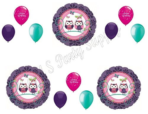 You will receive: Three (3) 18" Owl Pal round mylar balloons. Nine (9) 11" Coordinating latex balloons…3 Hot Pink Happy Birthday print, 3 purple and 3 aqua. All balloons are new and shipped uninflated. Just add helium!