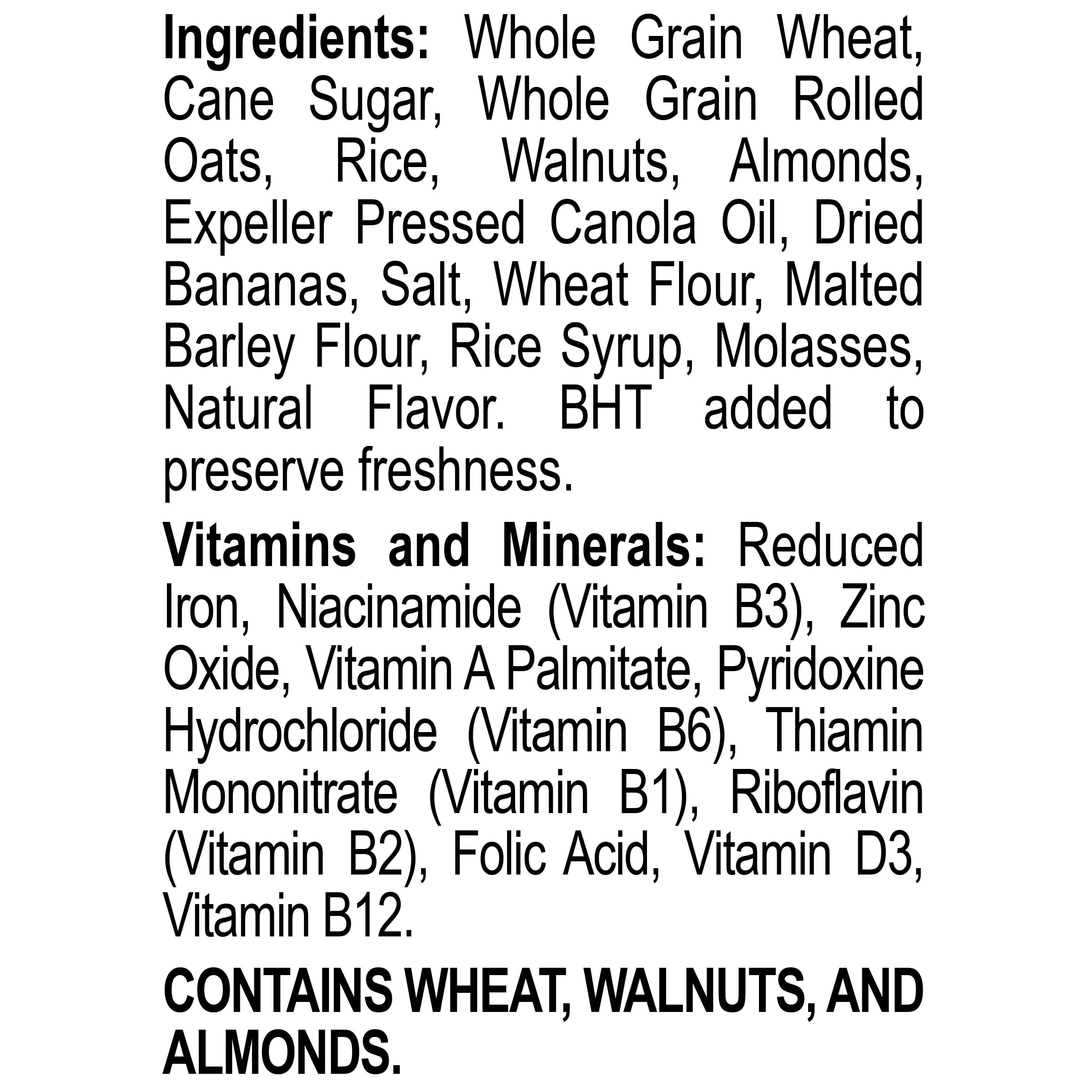 Bursting with wholesome flavor, Great Grains Banana Nut Crunch cereal is a delicious combination of crunchy, flakey cereal with added walnuts, almonds, and dried bananas.Great Grains Banana Nut Crunch cereal is low fat and heart healthy. This breakfast cereal has an impressive 43g of whole grain per serving and is a good source of fiber. Great Grains Banana Nut Crunch provides 12 essentialvitamins and minerals. Enjoy a bowl full of sweet banana goodness with crunchy satisfying walnuts and almonds. Plus, it’s free of artificial flavors and synthetic colors.Conquer your day when you choose Great Grains Banana Nut Crunch cereal.