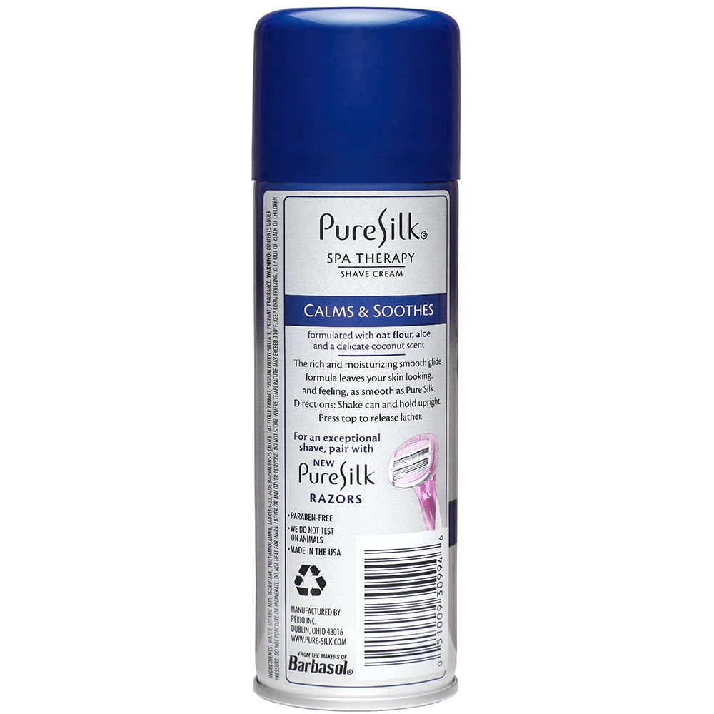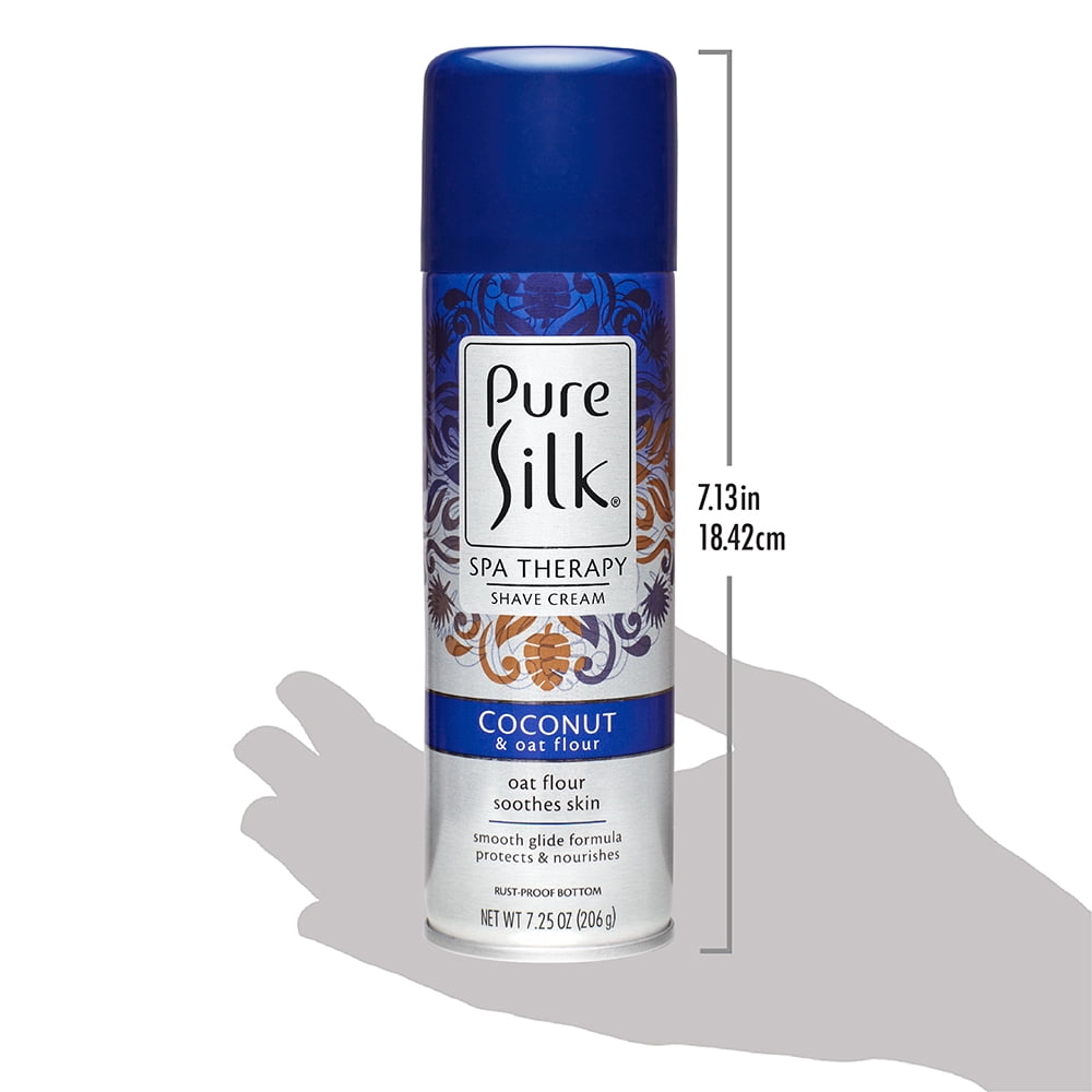 Pure Silk Coconut & Oat Flour Spa Therapy Shaving Cream combines the delicate scent of coconut with the moisturizing and skin-calming powers of oat flour and aloe. The infusion of rich moisturizers protects, nourishes and provides a smooth glide to leave your skin looking, and feeling, as smooth as pure silk. Pure Silk Shaving Cream is available in cans with rust-proof aluminum bottoms, making it ideal for the shower. For an exceptional shave, pair with Pure Silk razors. Directions: 1. Wet skin with warm water. 2. Shake can and hold upright. 3. Press top to release creamy lather. For Best Results: 1. Use gentle strokes with a sharp Pure Silk razor to avoid irritation. 2. Rinse the blade often during shaving. Warning: Contents under pressure. Do not puncture or incinerate. Do not heat for warm lather or any other purpose. Do not store where temperature may exceed 110°F. Keep out of reach of children.Shaving Cream that combines the delicate scent of coconut with the moisturizing and calming powers of oat flour and aloe; Protects, nourishes and provides a smooth glide to leave your skin looking, and feeling, as smooth as Pure Silk; Rust-proof aluminum bottom to prevent rust rings!; Paraben-free; No animal testing